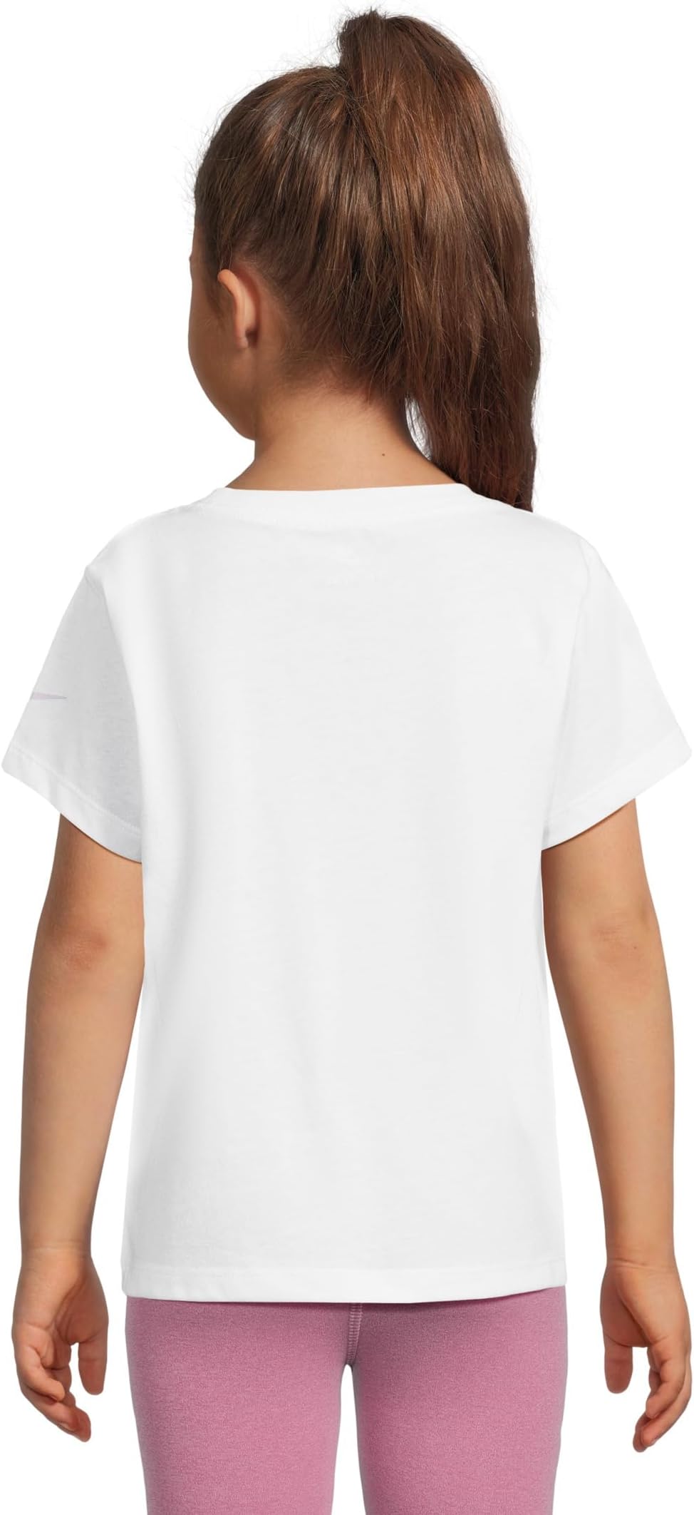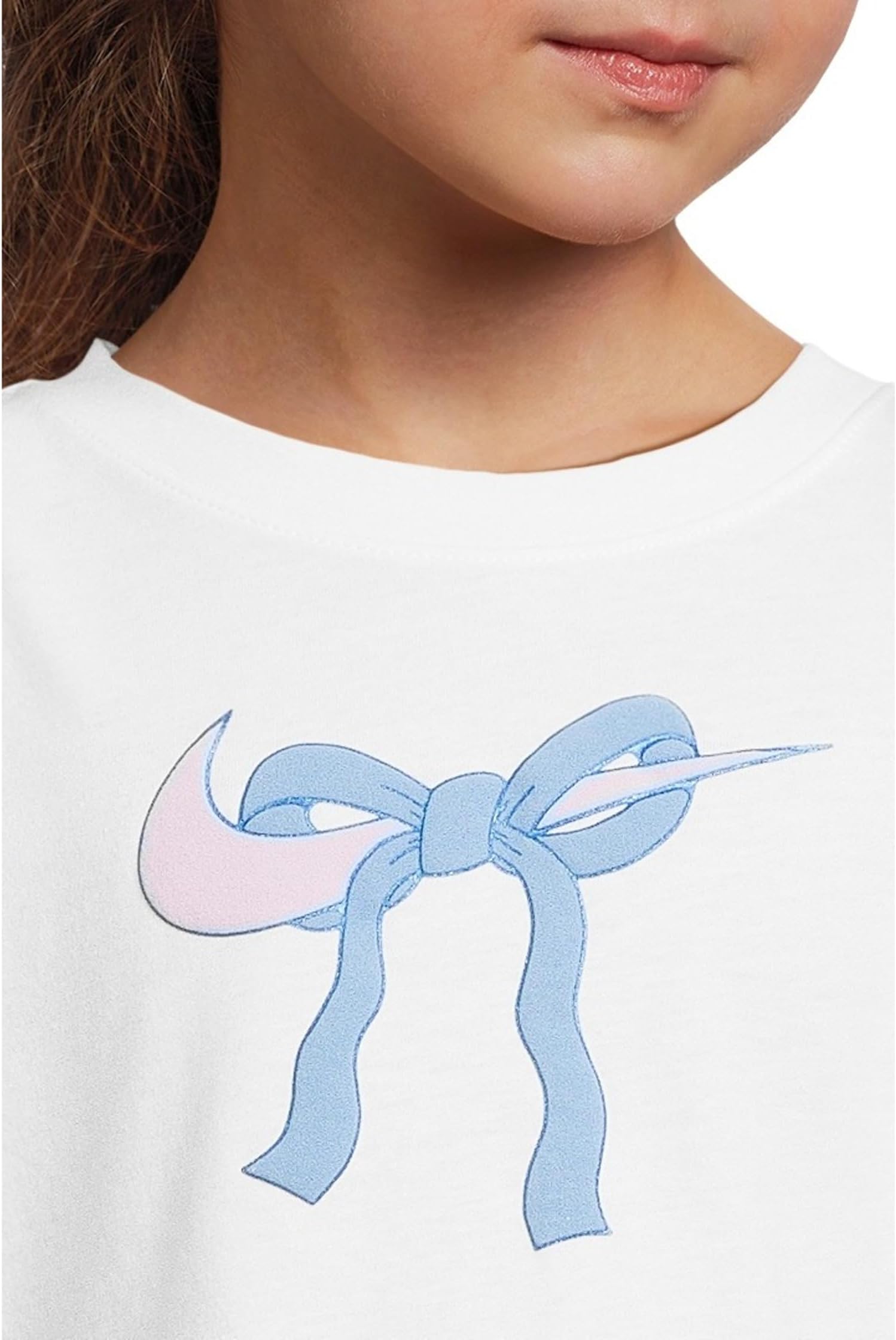 • Добавьте изящный штрих к своему образу для тёплой погоды с детской футболкой Nike Swoosh Ribbon. Эта футболка, которую можно надевать, имеет классический круглый вырез горловины, короткие рукава, графический принт спереди, логотип на левом рукаве и прямой подол.