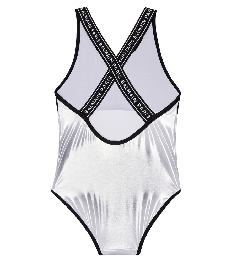 Подарите им радость от теплых стран с этим купальником от Balmain Kids. Он дополнен вставкой из ткани ламе, фирменным логотипом на груди и жаккардовым логотипом крест-накрест на спине.