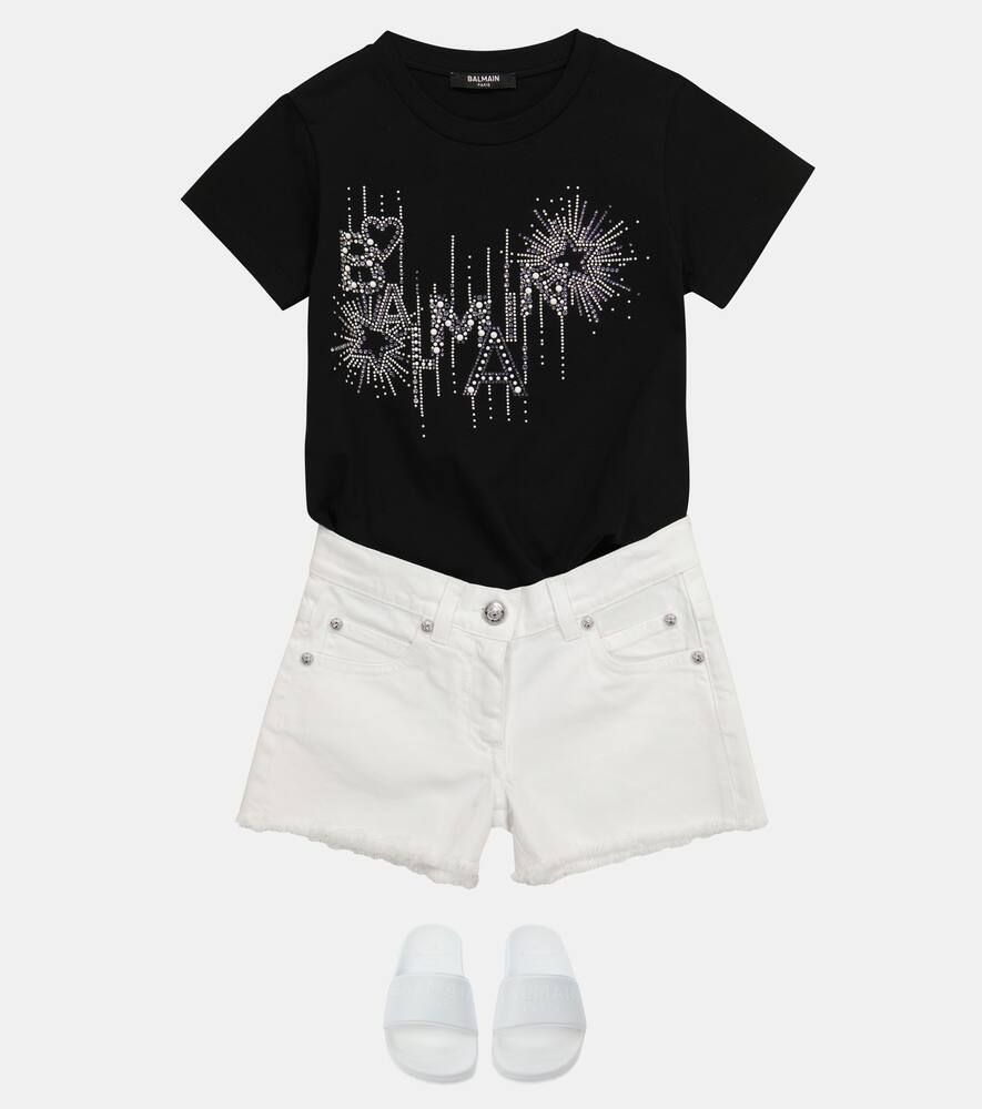 Добавьте эту футболку от Balmain Kids в повседневный гардероб вашего маленького модника. Изделие выполнено из чёрного хлопкового трикотажа, имеет свободный крой и украшено сверкающим логотипом бренда со звёздами.