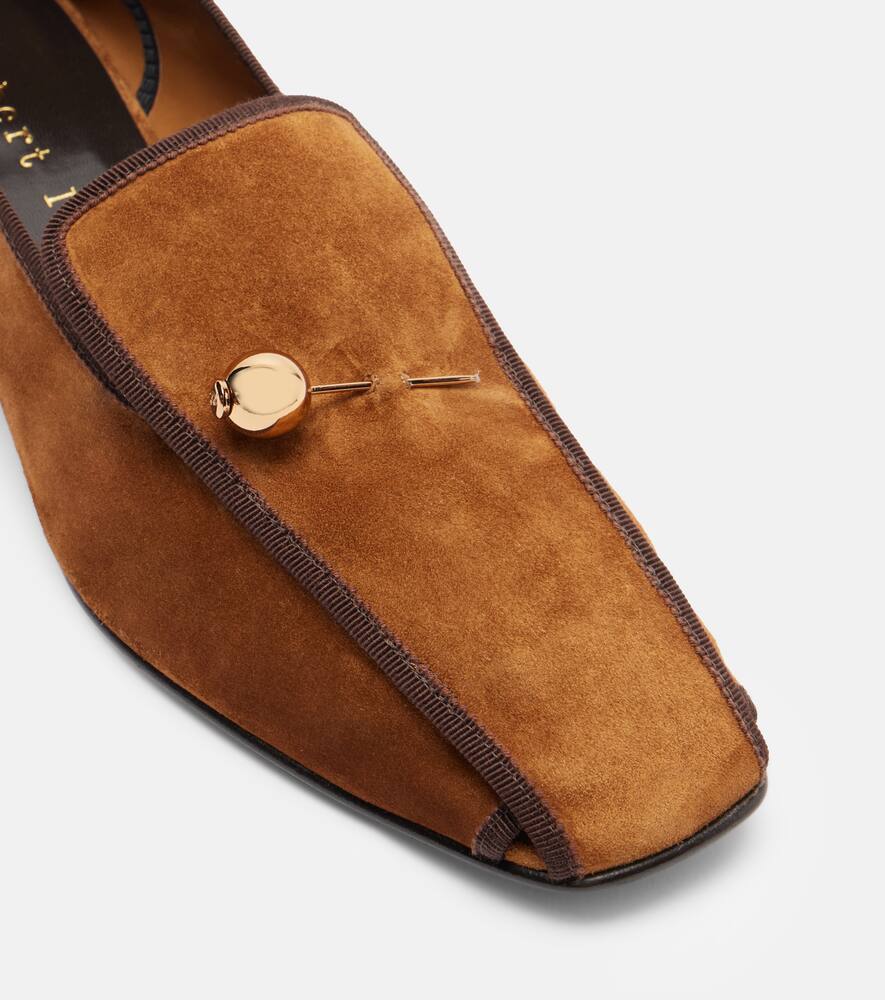 Визионерская обувь Герберта Левина стирает грань между модой и фантазией, воплощая смелый дизайн и художественную выразительность. Лоферы Showtime из замши отличаются квадратным носком, золотистой фурнитурой на верхе и блочным каблуком высотой 30 мм.