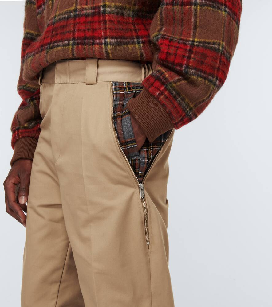 Undercover обновил классические чиносы клетчатыми фланелевыми вставками и деталями на молнии. Эта модель прямого кроя выполнена из твила и имеет заутюженные складки.