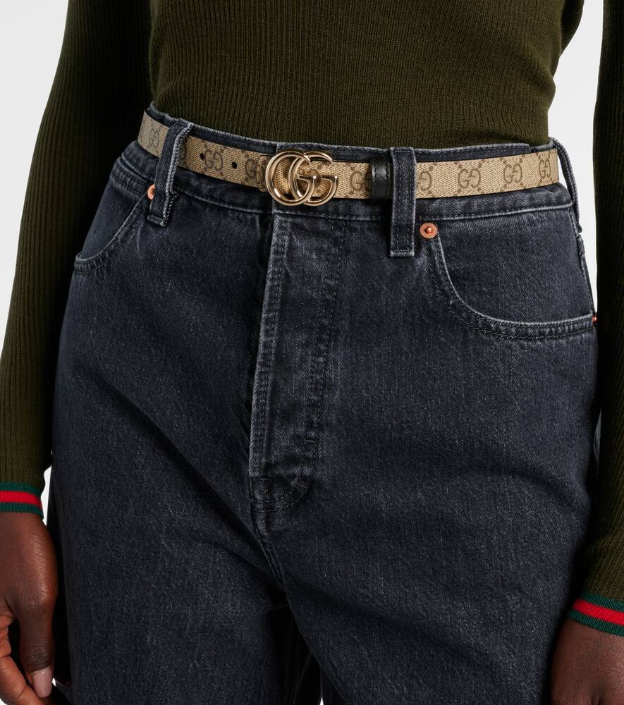 Ремень GG Marmont изготовлен в Италии: одна сторона — фирменная ткань, а другая — кожа. Ремень GG Canvas, представляющий собой историческую интерпретацию инициалов основателя Гуччо Гуччи, — ключевой элемент дома Gucci.