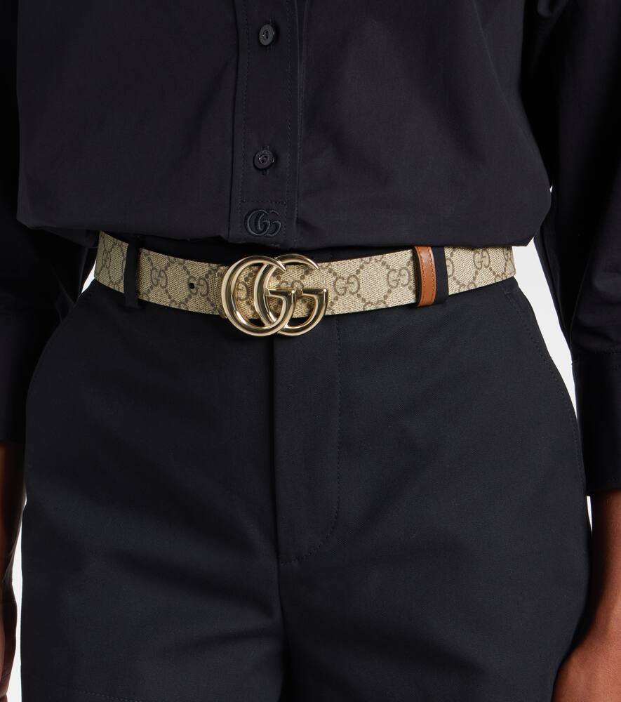Ремень GG Marmont с фирменной золотистой фурнитурой выполнен из культовой ткани бренда с кожаной подкладкой. Канва GG Supreme, представляющая собой историческую интерпретацию инициалов основателя Гуччио Гуччи, является ключевым элементом бренда.