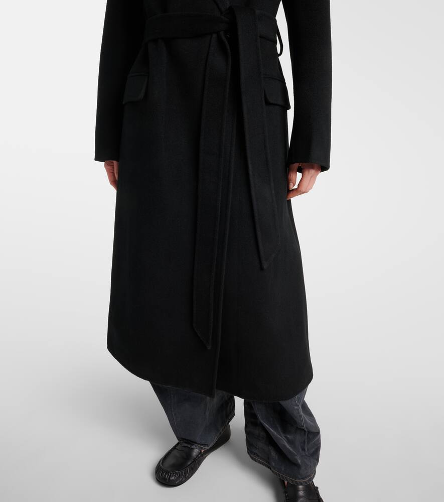 Стокгольмский бренд Acne Studios завоевал прочную популярность благодаря своей стильной скандинавской эстетике. Это классическое пальто-халат из тёплой смеси шерсти и кашемира дополнено поясом в тон и заострёнными лацканами.