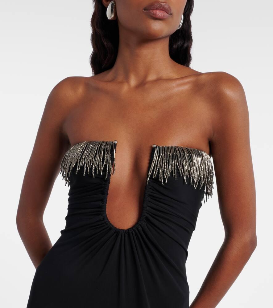 Платье макси Arced Palm от Christopher Esber выполнено из мягкого джерси и имеет скульптурный силуэт. Без бретелек инкрустировано изящными сборками по глубокому вырезу, расшитому бисером, что придаёт ему соблазнительный вид.