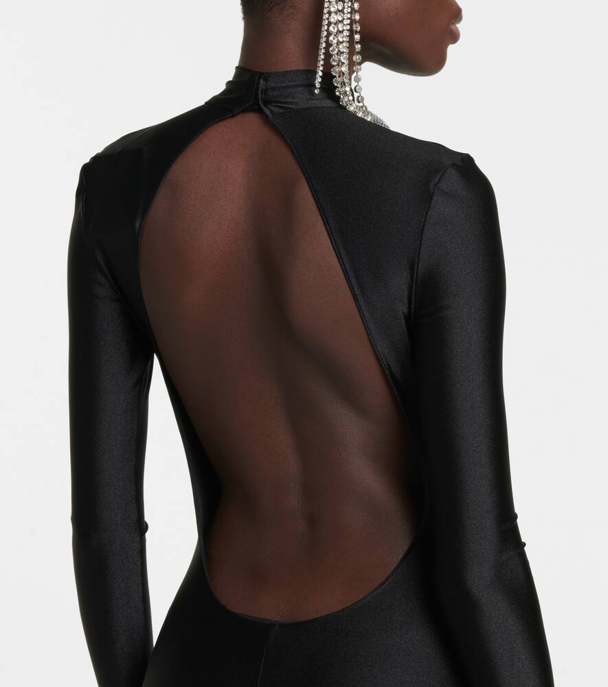 Этот комбинезон от Giuseppe di Morabito, сочетающий в себе гламур и комфорт, идеально подходит для вечерних мероприятий. Он выполнен из эластичной клеёной ткани, облегает фигуру, имеет вырез на груди и украшен розой, украшенной кристаллами.