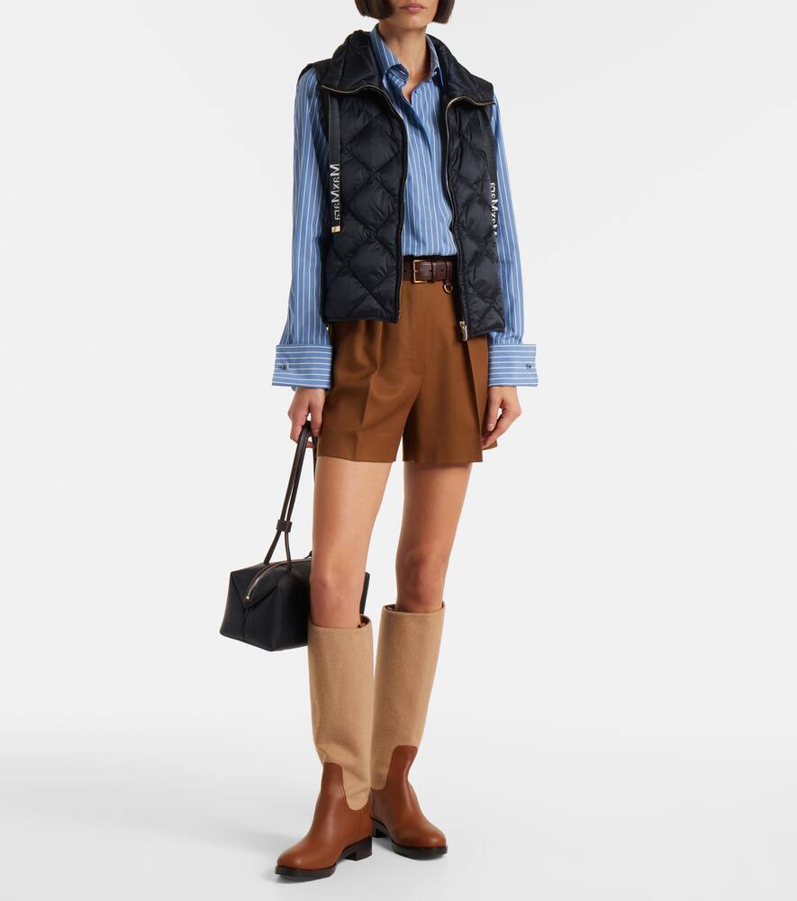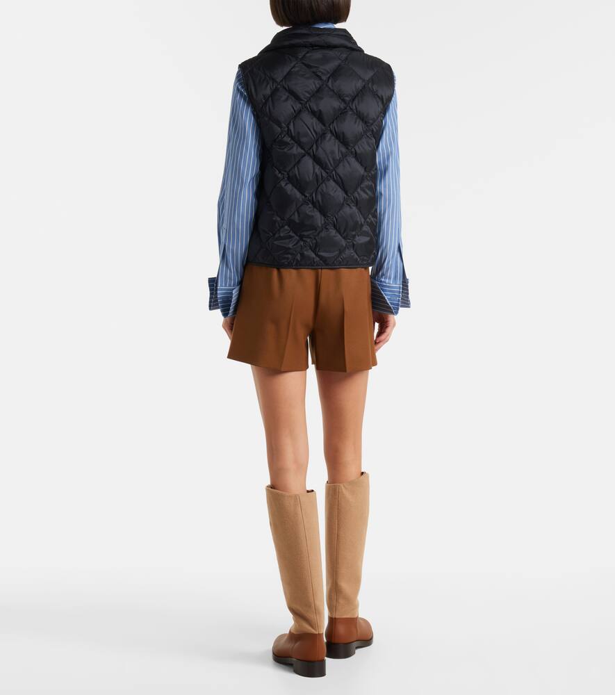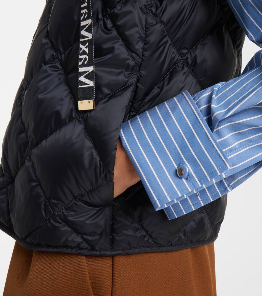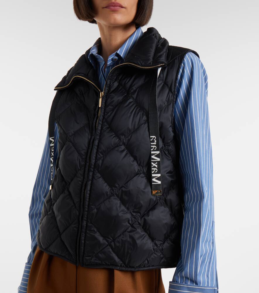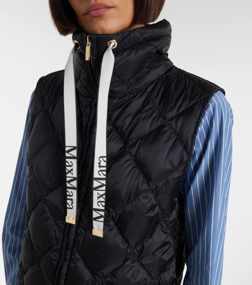 Жилет Tregic с ромбовидной стёжкой от Max Mara выполнен из водоотталкивающего, мерцающего нейлонового полотна. Модель застёгивается на молнию, имеет высокий воротник на шнурке, боковые карманы и фирменные полоски с логотипом.
