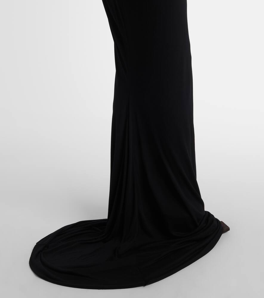 Рик Оуэнс привносит готические и индустриальные мотивы в авангардный дизайн. Платье Lilith выполнено из струящегося джерси и имеет силуэт до пола, элегантную драпировку и короткие рукава.