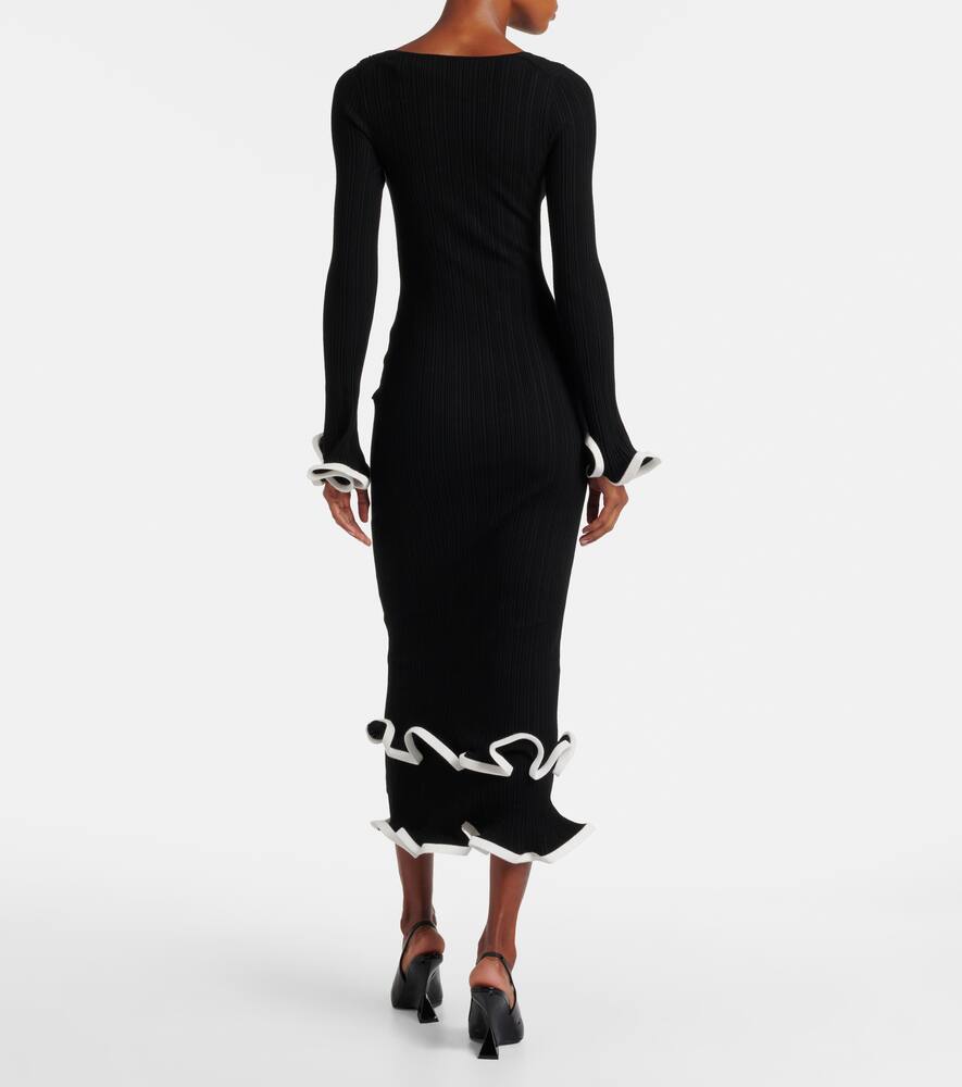 Вдохновляясь скульптурой и архитектурой, Симхай создаёт впечатляющие модели, сочетающие инновационный крой с ручной проработкой деталей. Платье миди Solani выполнено из тонкого трикотажа в рубчик и имеет облегающий силуэт с контрастной отделкой в виде воланов.