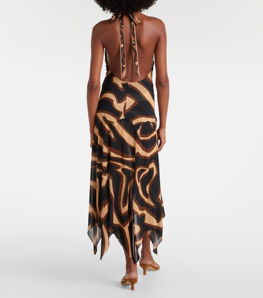 Культовый психоделический узор в виде завитков — фирменный знак бренда, благодаря которому Pucci получил титул Принца принтов. Это платье миди из муслинового трикотажа с фирменным узором Лабиринт имеет халтер на завязках.