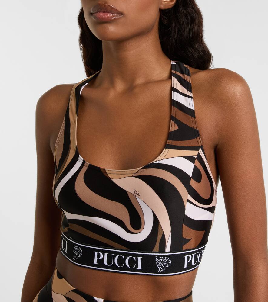 Этот спортивный бюстгальтер Pucci изготовлен из технологичного материала с логотипом на ленте и дополнен принтом Marmo. Этот культовый психоделический узор в виде завитков стал визитной карточкой бренда, благодаря которому бренд получил титул Принц принтов.