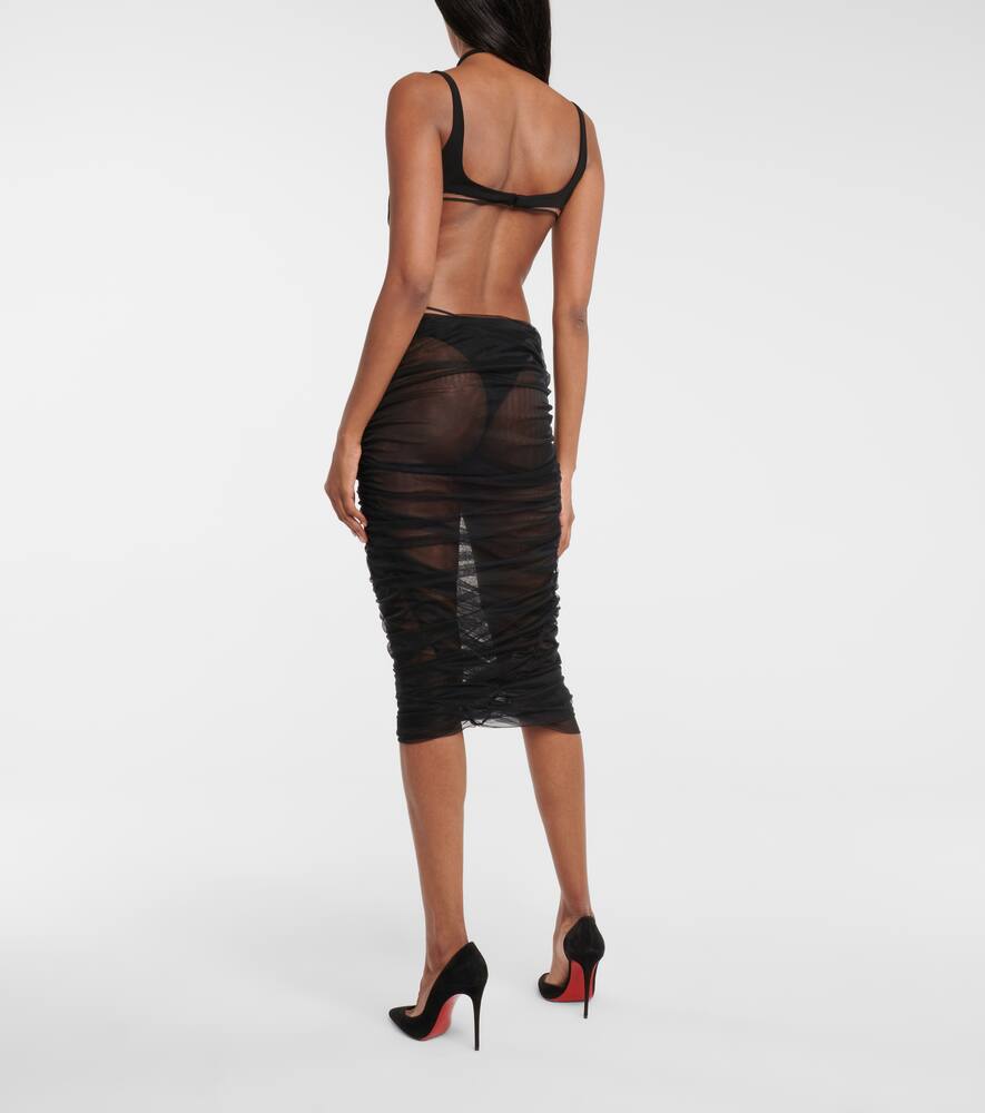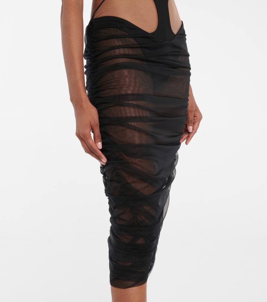 Женщина MUGLER от Кейси Кэдуолледер не боится чувственности, что наглядно демонстрирует это чёрное платье миди. Напоминающая культовые творения дома 80-х, эта модель из эластичного трикотажа имеет перекрещивающиеся верхние части в стиле бондаж и откровенные прозрачные вставки и вырезы. Дополните образ облегающими босоножками-обёртками, чтобы привлечь внимание к тонкой юбке со сборками.