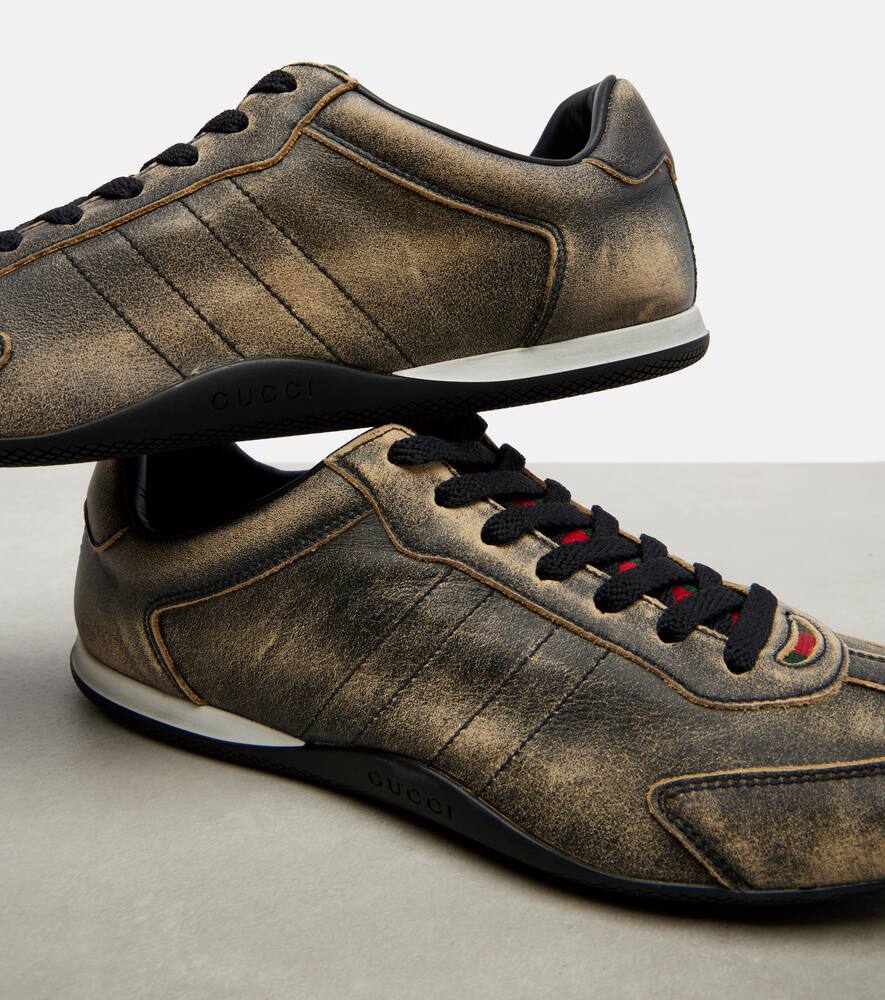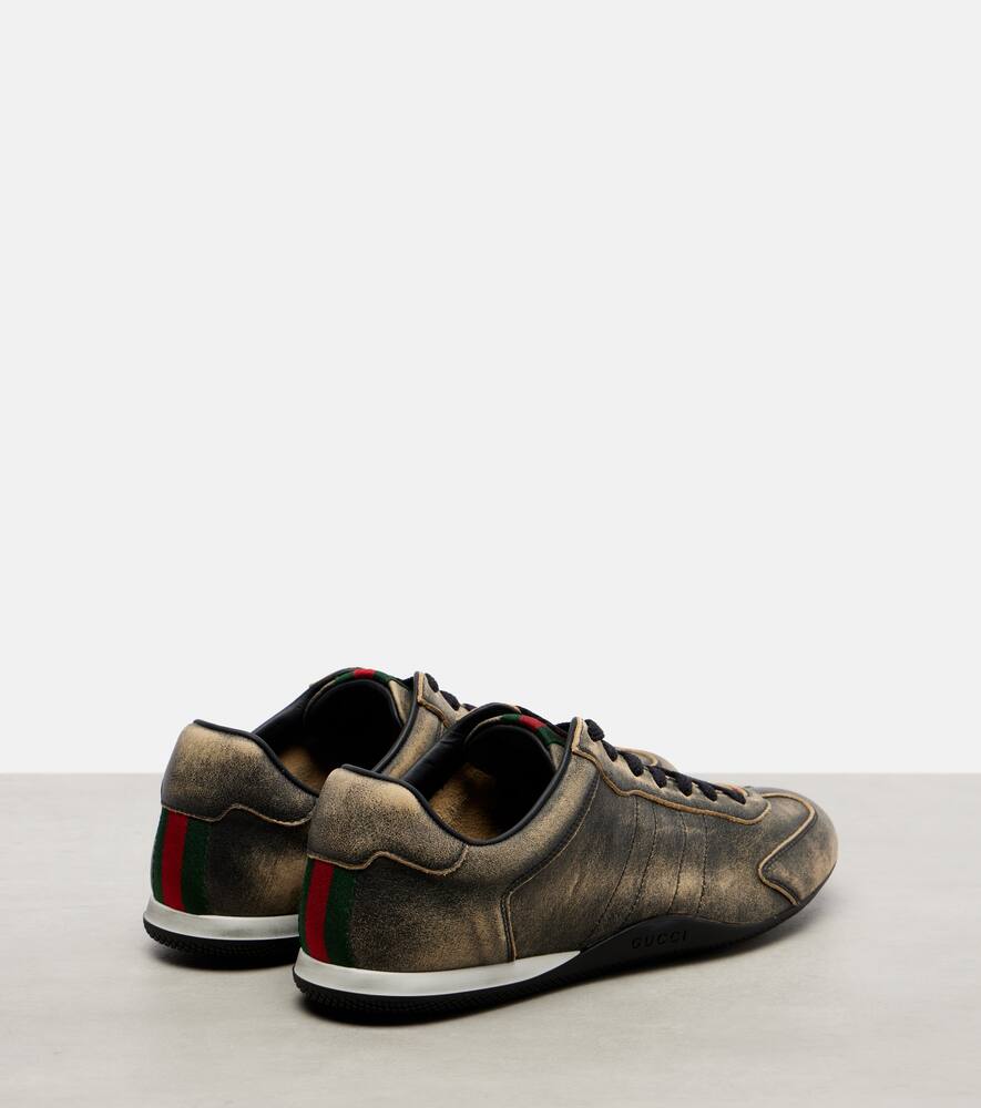 Фирменная зелёно-красная полоска Gucci Web, дебютировавшая в 1951 году, была вдохновлена ремнями конных сёдел. Эта эмблема особенно выделяется на кроссовках Gucci Shift, изготовленных из мягкой кожи с эффектом потертости.