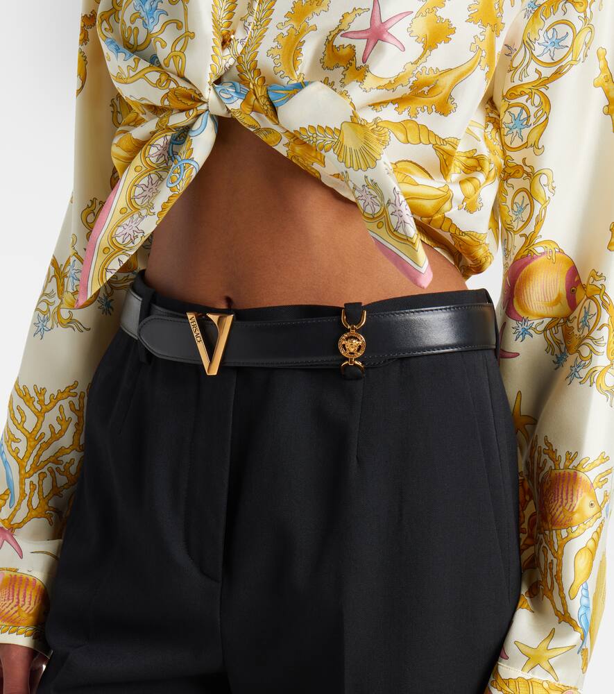Дополните свой образ изысканными аксессуарами, например, этим элегантным ремнем Versace из полированной кожи с V-образной пряжкой.