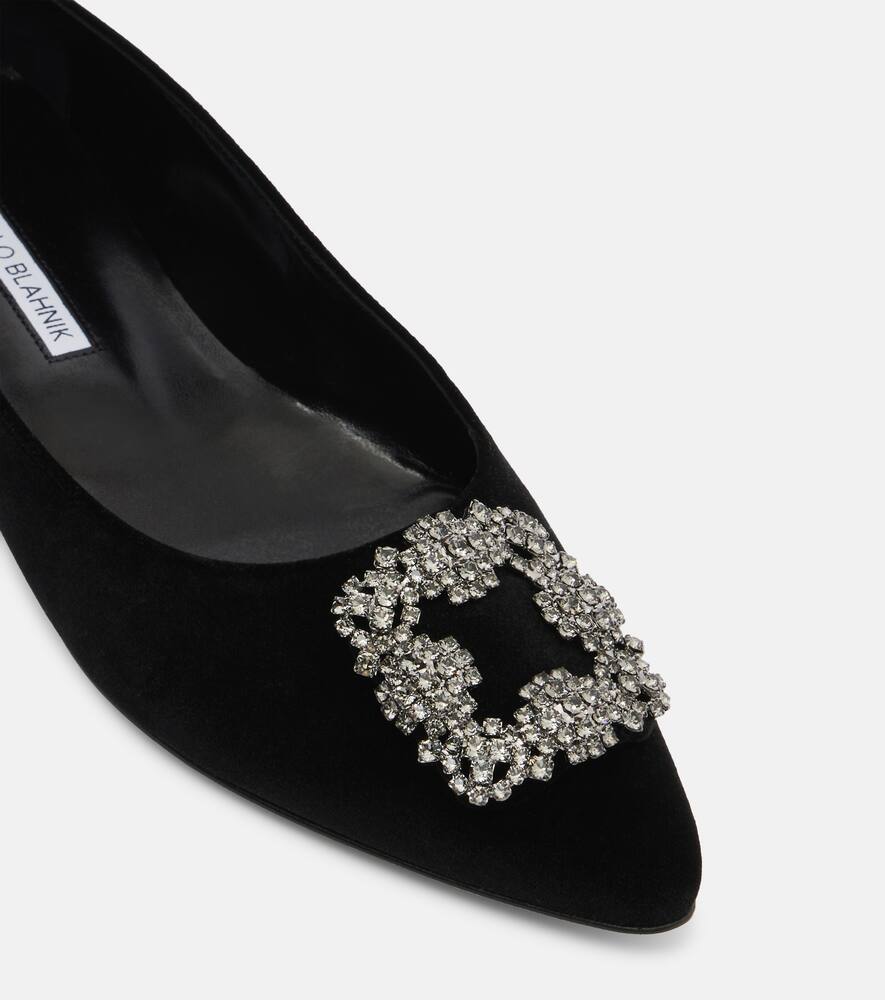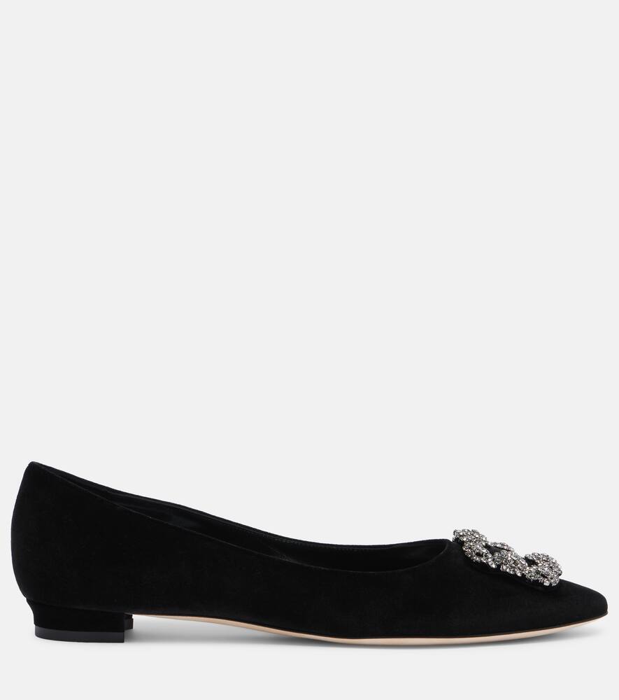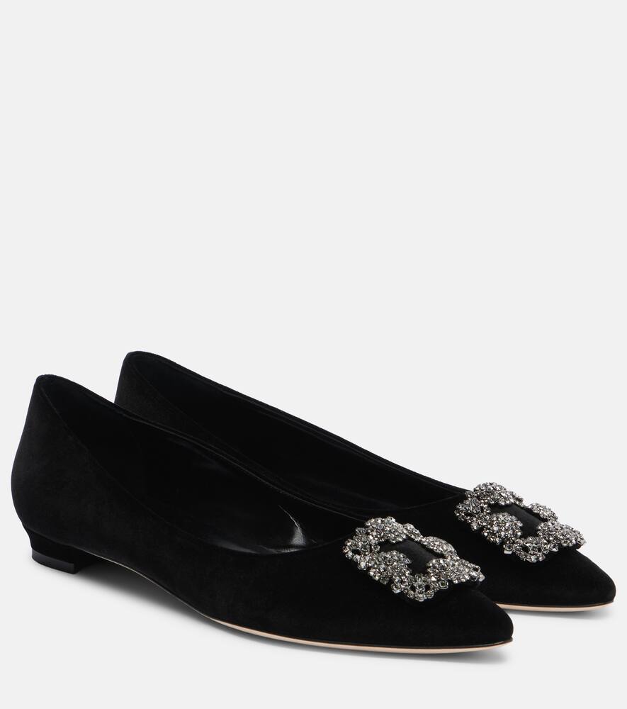 Серия туфель Manolo Blahnik с драгоценными пряжками наглядно демонстрирует любовь дизайнера к сверкающим аксессуарам. Балетки Hangisi изготовлены в Италии. Верх из чёрного бархата, миндалевидные носки и пряжки, украшенные кристаллами, сверкают при каждом шаге.
