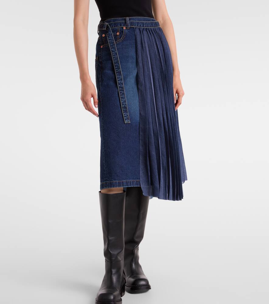 Sacai славится своими уникальными инновационными моделями, характеризующимися сочетанием текстур, тканей и техник. Эта юбка миди из тёмного денима с плиссированным верхним слоем и поясом на талии.