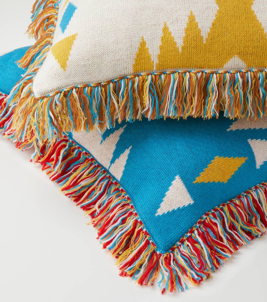 Подушка Icon от Alanui украшена тем же жаккардовым узором, что и знаменитый кардиган бренда. Изготовленная из шерсти, она дополнена отделкой в виде бахромы.