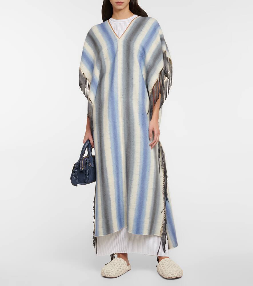 Этот кафтан Chloé из мягкой смеси кашемира и шелка украшен узором в белую и синюю полоску по всей поверхности и дополнен бахромой по краям.