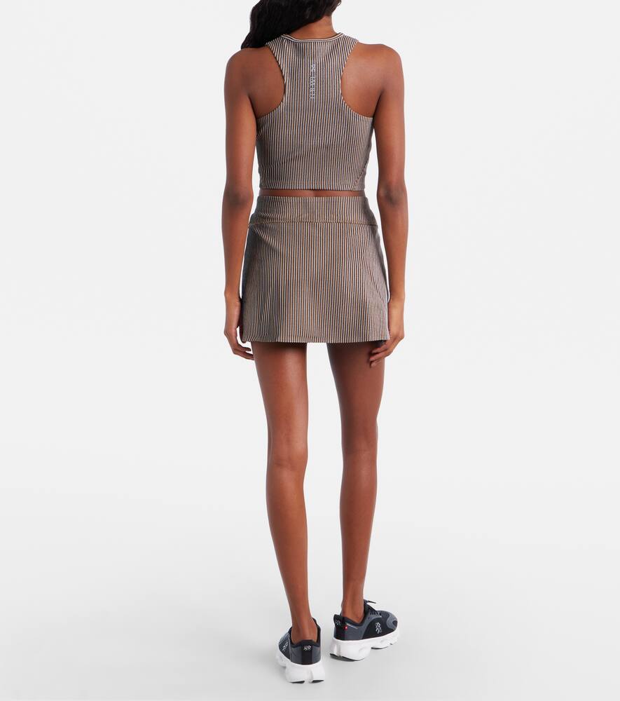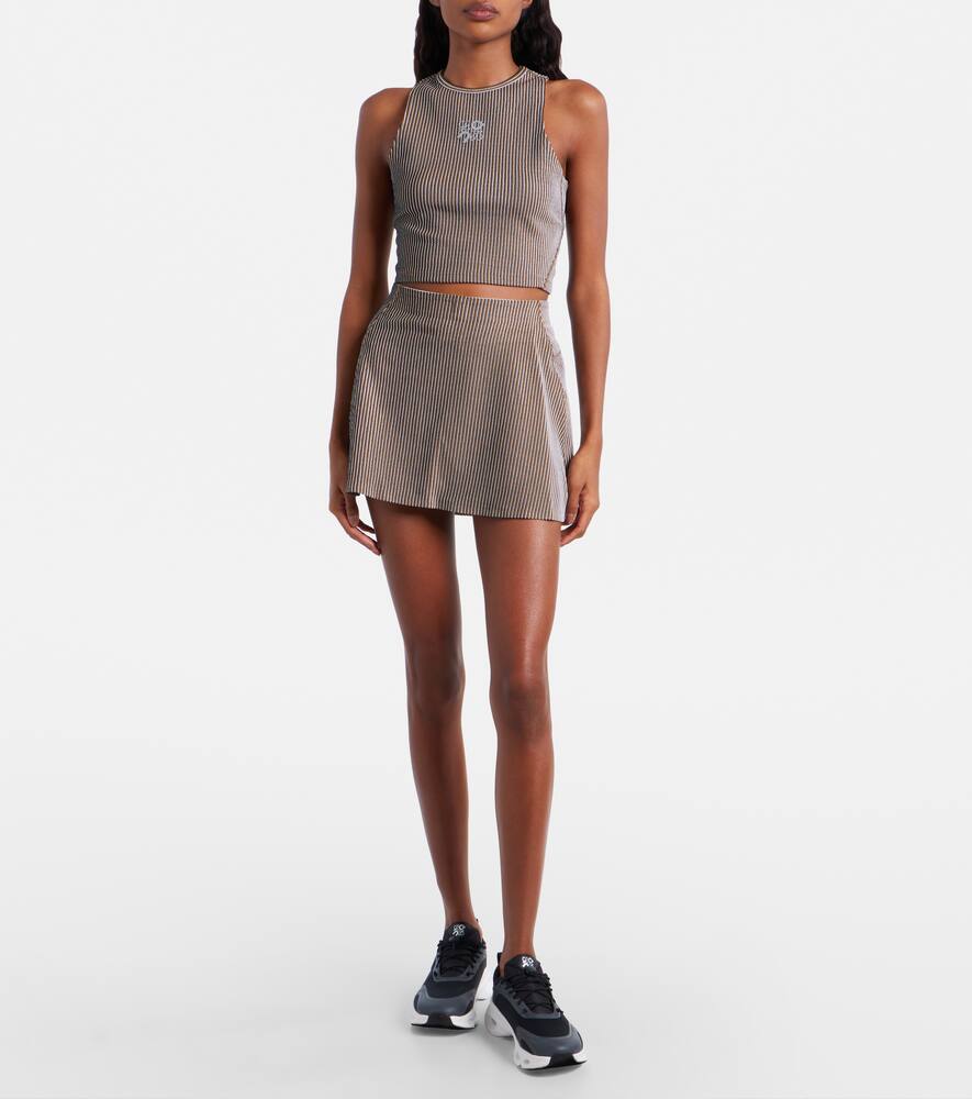 Совместная работа Loewe и On обещает создать базовые модели для активного отдыха в современном стиле. Эта мини-юбка из технического джерси с микрожаккардовым узором в рубчик имеет вшитые шорты.