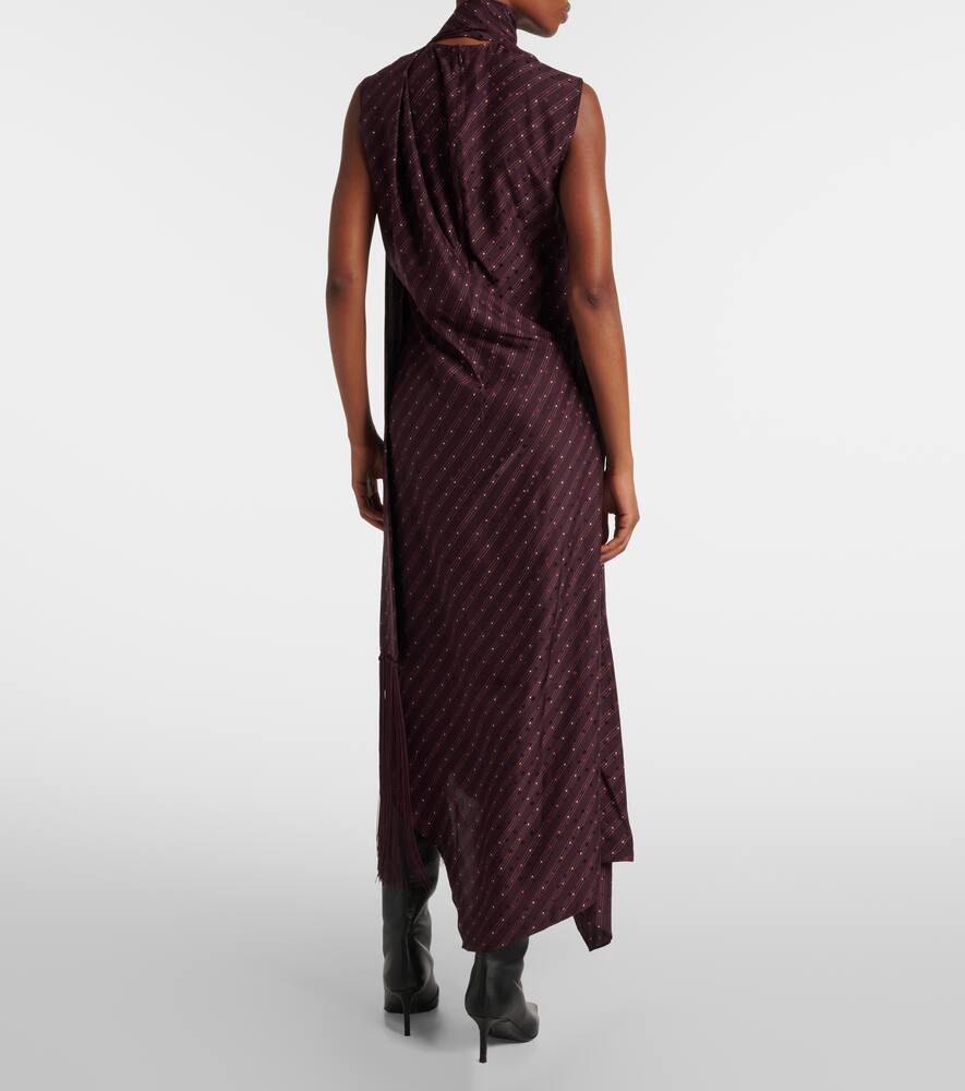 Это миди-платье от Acne Studios выполнено из лёгкого шёлка. Модель без рукавов отличается высоким вырезом, шарфом с бахромой, ниспадающим к подолу, и жаккардовым узором в горошек по всей поверхности.