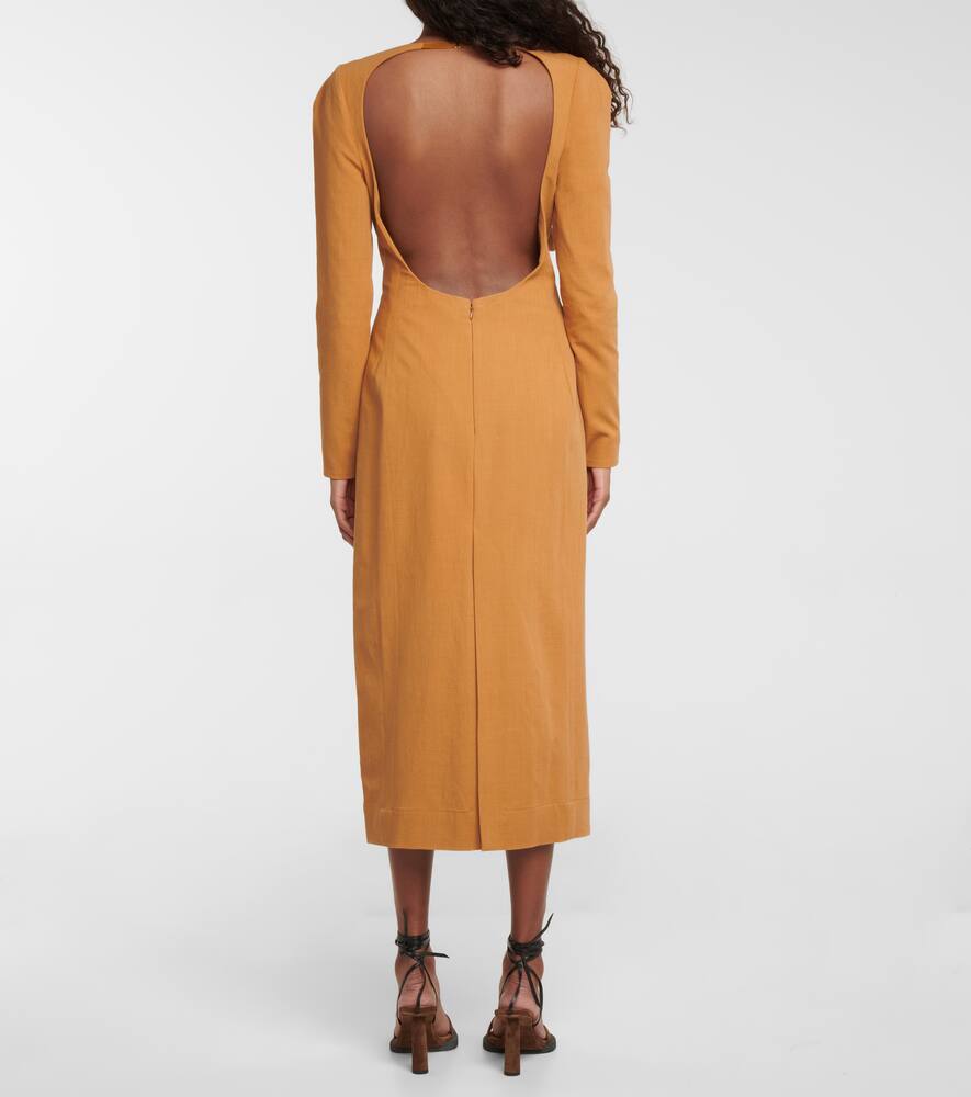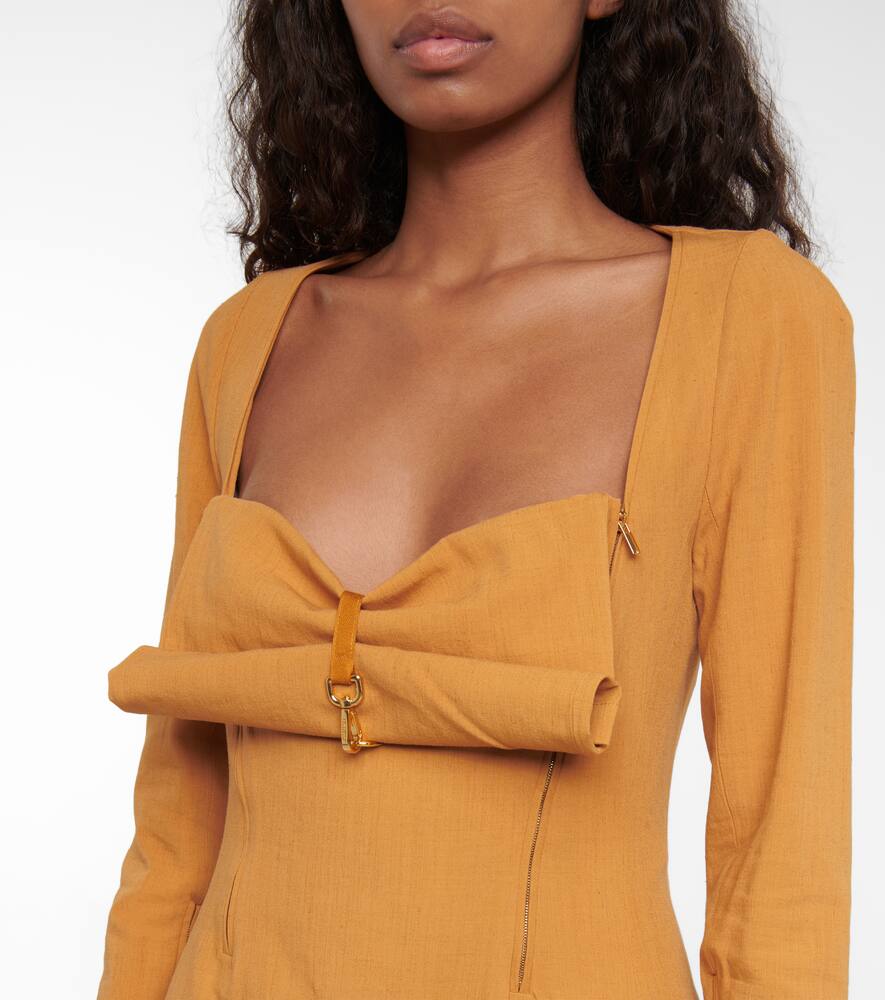Платье миди La Robe Terra от Jacquemus выполнено из ткани цвета верблюжьей шерсти с добавлением льна. Вырез сердечком регулируется с помощью ремешка-застёжки. Открытая спина и манжеты на молнии.