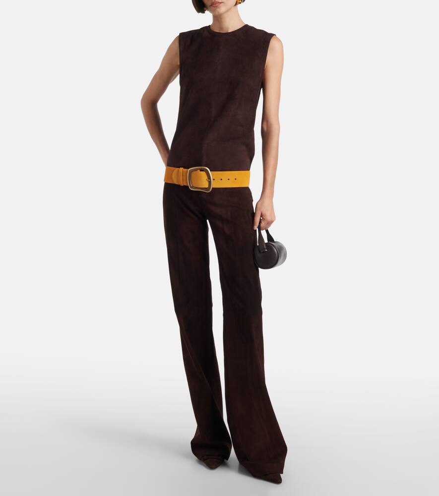 Мягкая и эластичная кожа Stouls — фирменный материал, известный своим превосходным качеством и пригодностью для машинной стирки. Топ Miuccia, изготовленный в Португалии из коричневой замши, представляет собой безрукавку с тональной строчкой по центру.