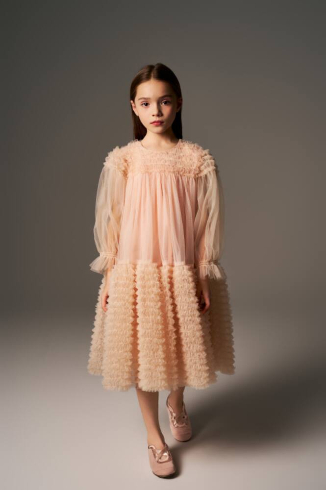 В коллекции детской одежды C'era Una Volta найдите классические вещи, которые будут радовать вас сейчас и всегда. Платье из тюля Carlota очаровывает мягкими оборками, рукавами-буфами и классической застёжкой на пуговицах сзади — идеально для особых моментов и приятных воспоминаний.