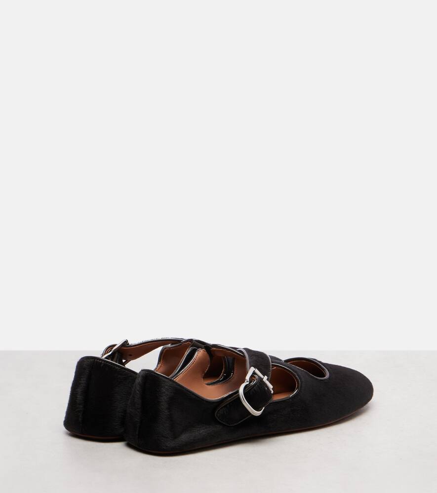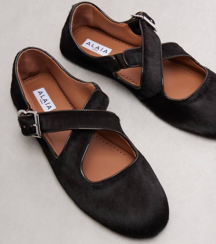 Уникальные силуэты и безупречная отделка отличают модели Alaïa. Эти балетки изготовлены из телячьей шерсти для тактильного эффекта и оснащены перекрещивающимися ремешками с пряжками.