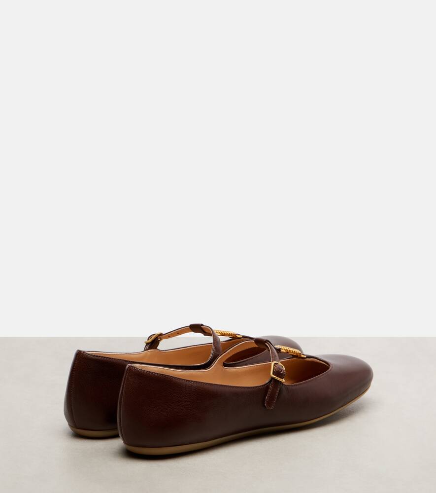 Балетки Leonore от Chloé воплощают изысканность благодаря своему классическому силуэту. Они изготовлены из кожи, застёгиваются на пряжки и украшены золотистыми подвесками-логотипами на верхних лямках.