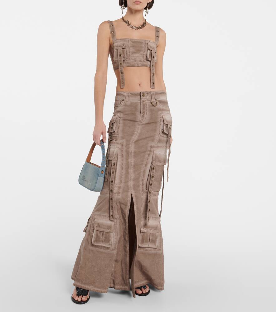 Этот укороченный топ от Blumarine в утилитарном стиле отличается накладными карманами карго и люверсами на массивных лентах и бретелях. Топ выполнен из денима, имеет квадратный вырез и ультракороткий подол.