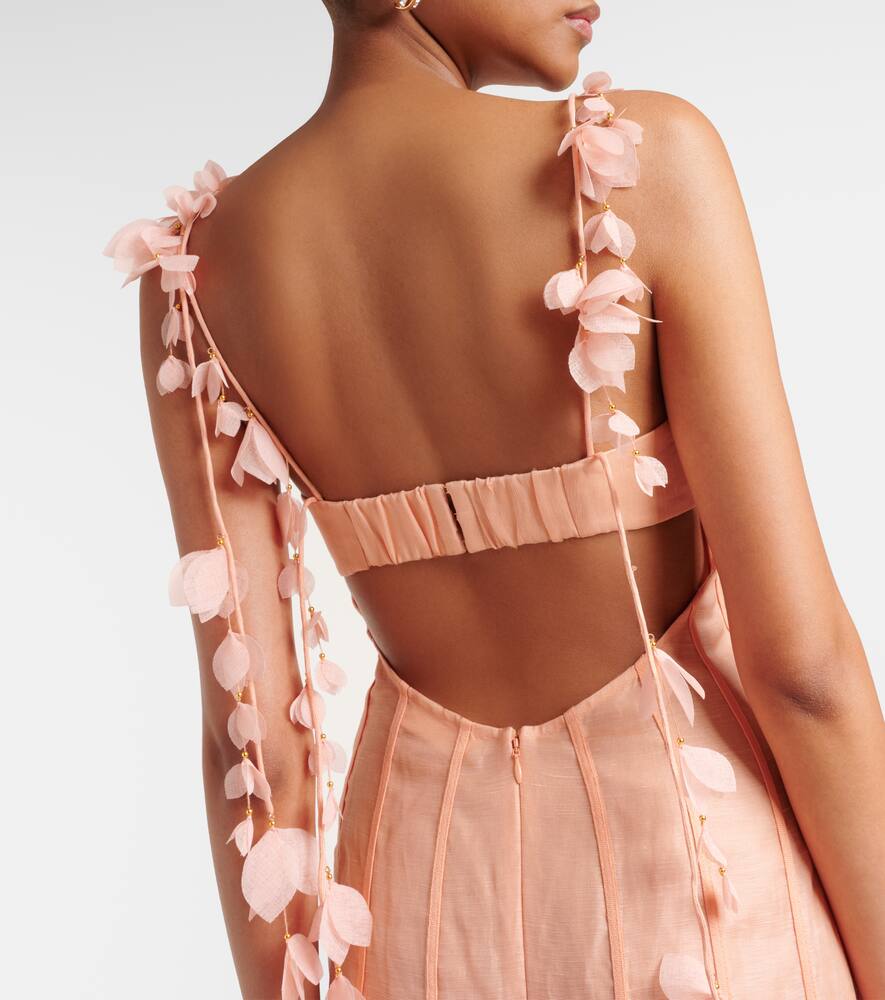 Воздушность и романтика — едва ли можно назвать поверхностным описанием изделий Zimmermann. Платье миди Dawning из льна и шёлка украшено декором в виде лепестков, открытой спиной и силуэтом рыбий хвост.