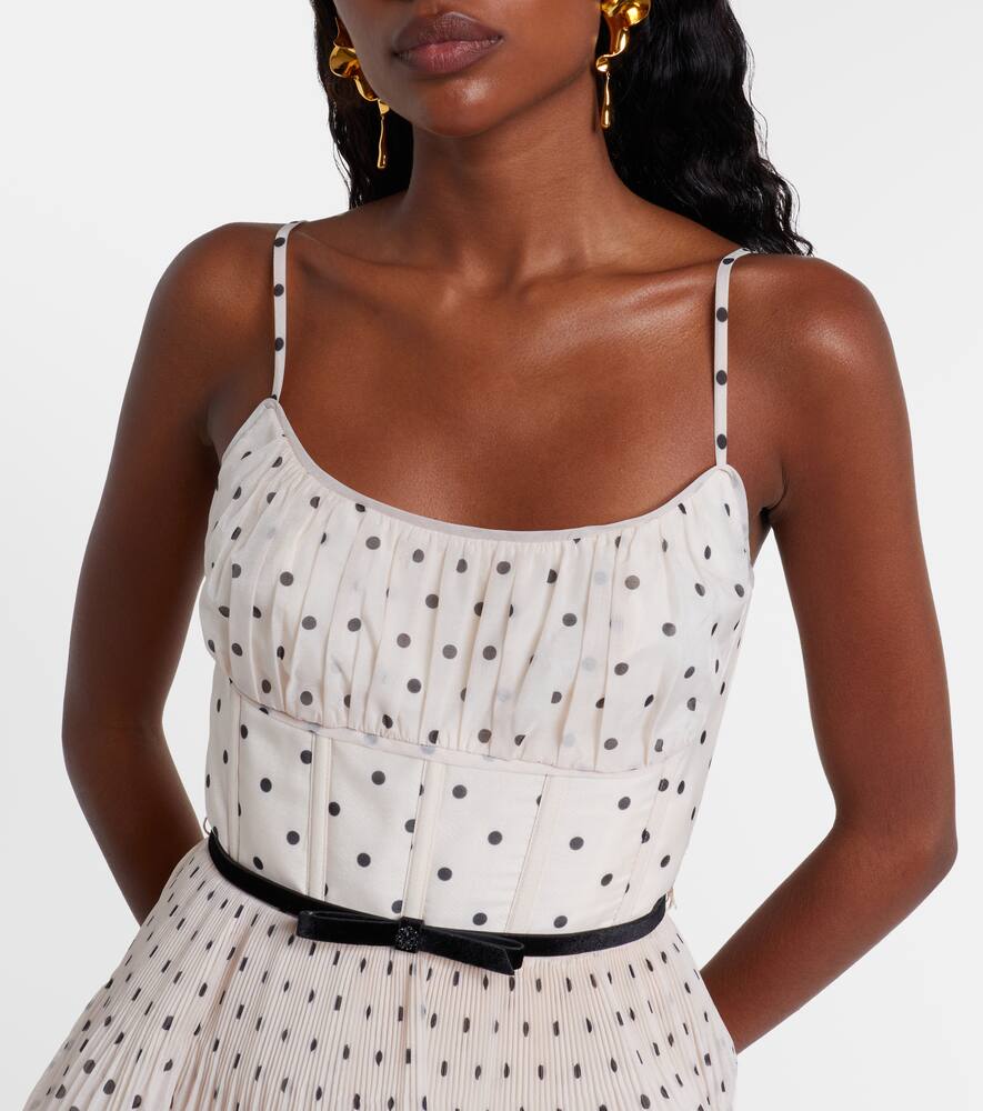 Особые моменты требуют ярких образов, как это миди-платье от Zimmermann. Модель с принтом в горошек отличается многоуровневым плиссированным силуэтом, внутренними косточками для придания структуры и тонким съёмным поясом.