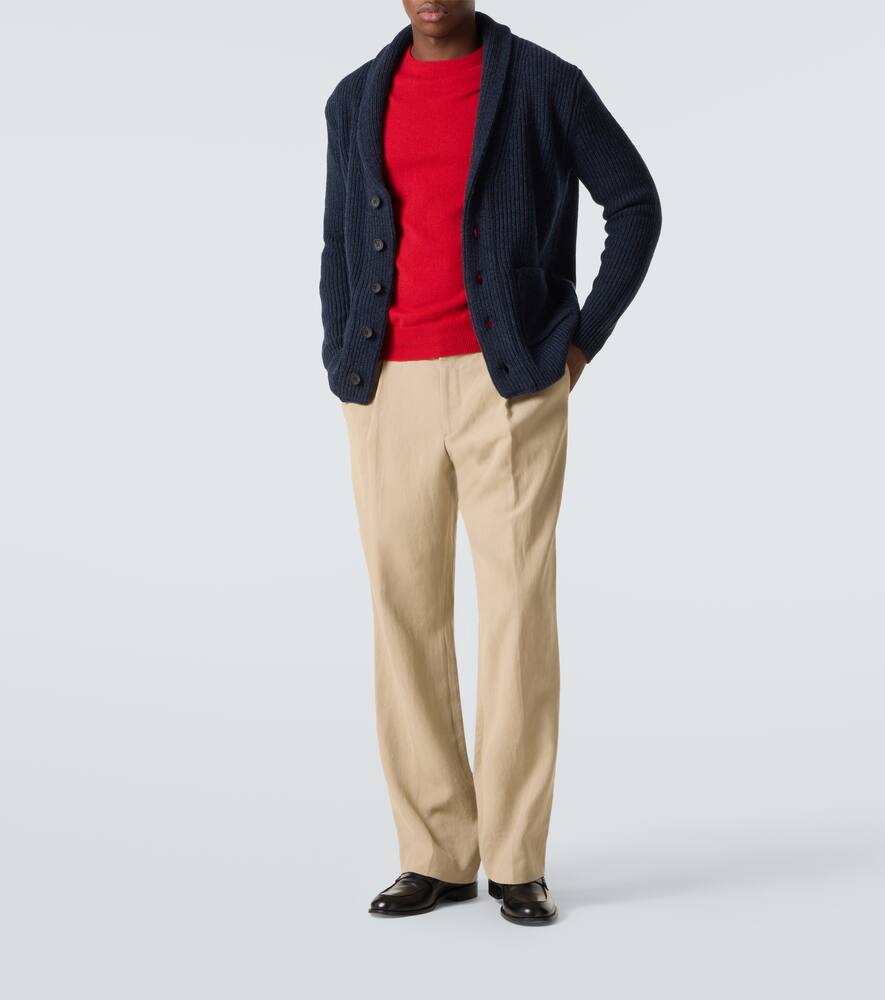 Дополните сезонные образы тёплыми слоями, как, например, этот кардиган от Thom Sweeney. Модель связана из шерсти и кашемира в рубчик, имеет шалевый воротник и накладные карманы.