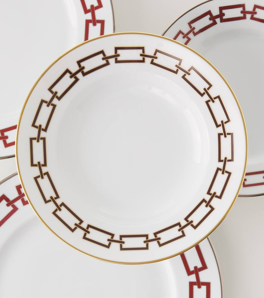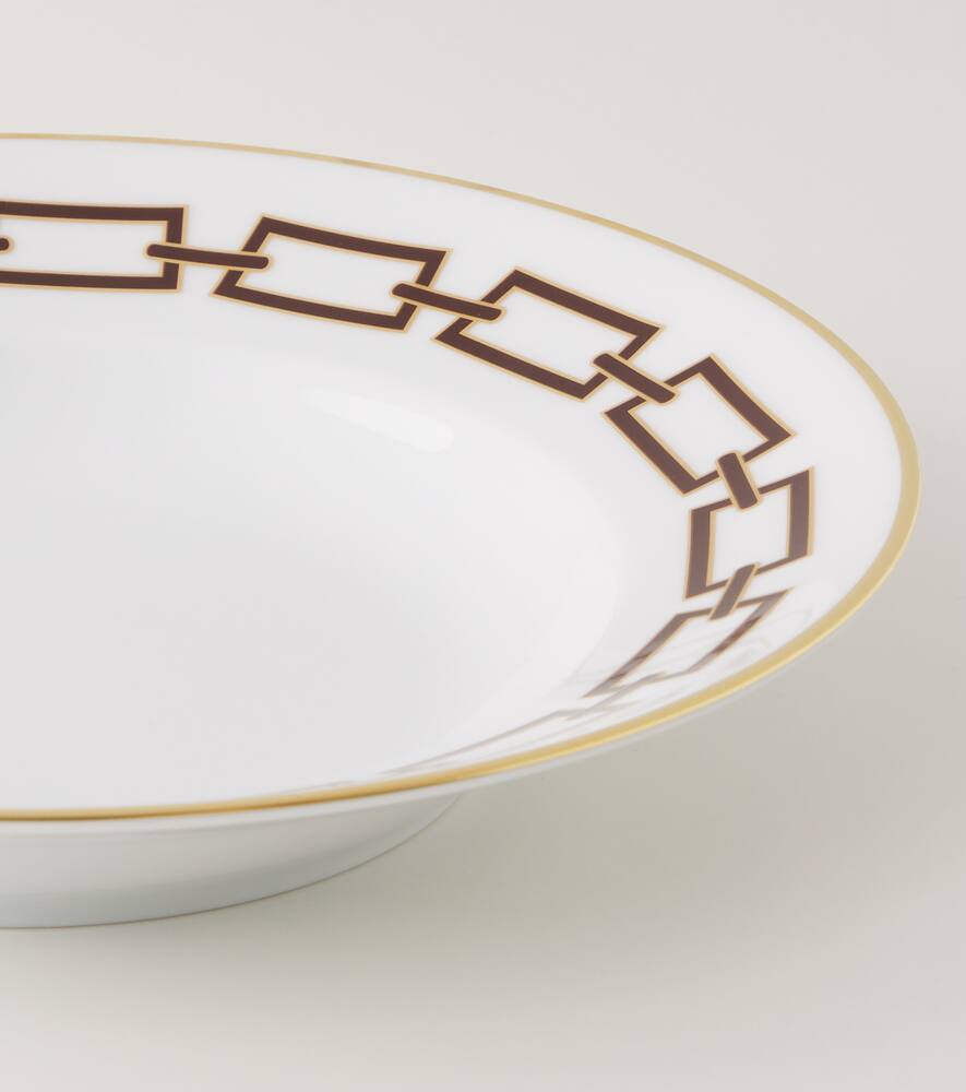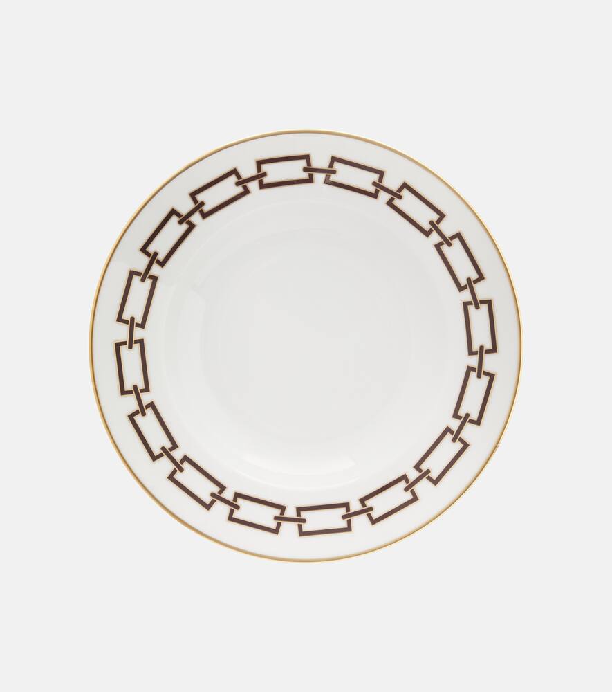 Коллекция Catene, посвящённая Джо Понти, сочетает в себе классические каноны и современную изысканность. Эта суповая тарелка, изготовленная из высококачественного фарфора, украшена элегантным геометрическим узором и позолоченной отделкой.