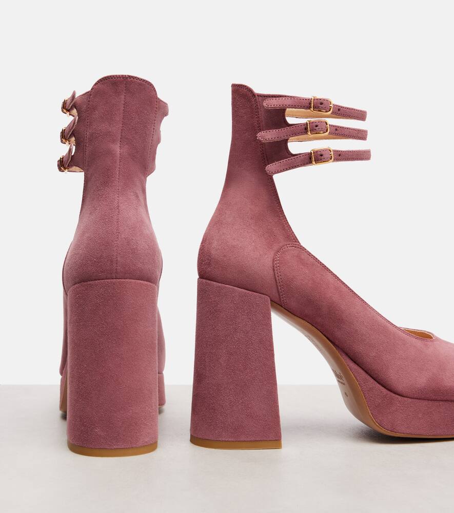 Достигните вершин стиля с туфлями на платформе Loti от Chloé. Туфли из розовой замши отличаются блочным каблуком высотой 100 мм, тонким квадратным носком и тремя ремешками на щиколотке с золотистыми пряжками Chloé.
