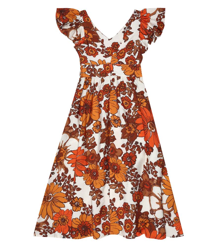 Это очаровательное платье от Dodo Bar Or Kids украшено ретро-цветочным мотивом. Оранжево-коричневая модель выполнена из поплина и имеет рукава с воланами, присборенную талию и пышную юбку, в которой можно кружиться.