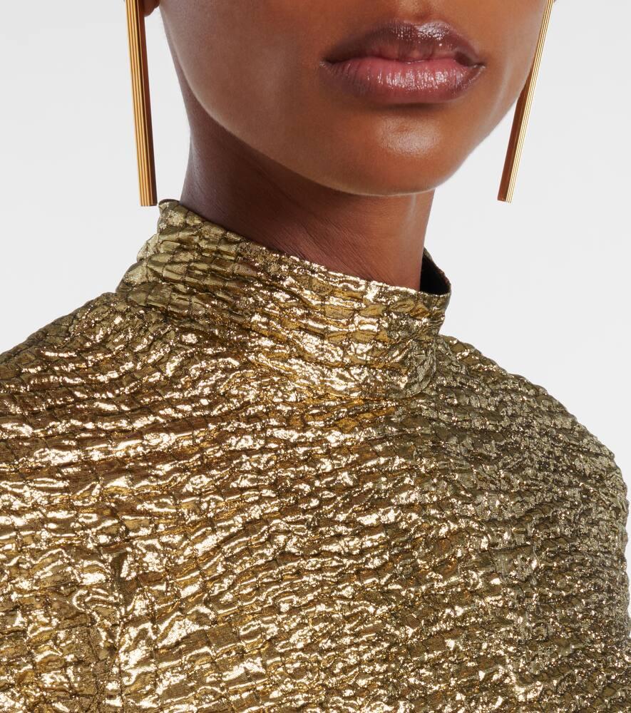 Emilia Wickstead, одновременно изысканная и лаконичная, доказывает, что простые, чётко выверенные силуэты всегда будут привлекать внимание. Платье Malinda выполнено из золотистой мерцающей ткани, а его лиф с короткими рукавами плавно переходит в очаровательную расклешённую юбку.