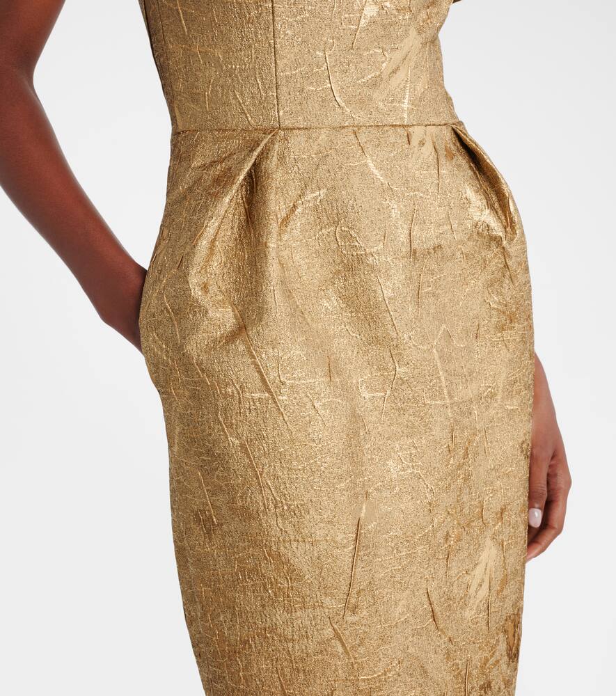 Золотистое платье Solana от Rebecca Vallance — эффектный предмет гардероба с открытыми плечами. Благодаря структурированному лифу и элегантному силуэту колонна это платье идеально подойдет невесте, которая ищет незабываемый образ.