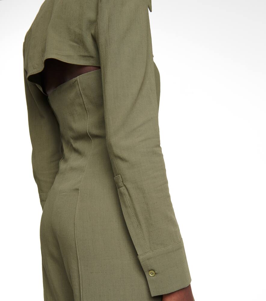 Комбинезон La Combinaison Asao от Jacquemus сочетает в себе современный дизайн и стиль 90-х. Он выполнен из плотной льняной ткани цвета хаки, имеет ажурные вырезы на кокетке и слегка расклешенные штанины, визуально удлиняющие фигуру.