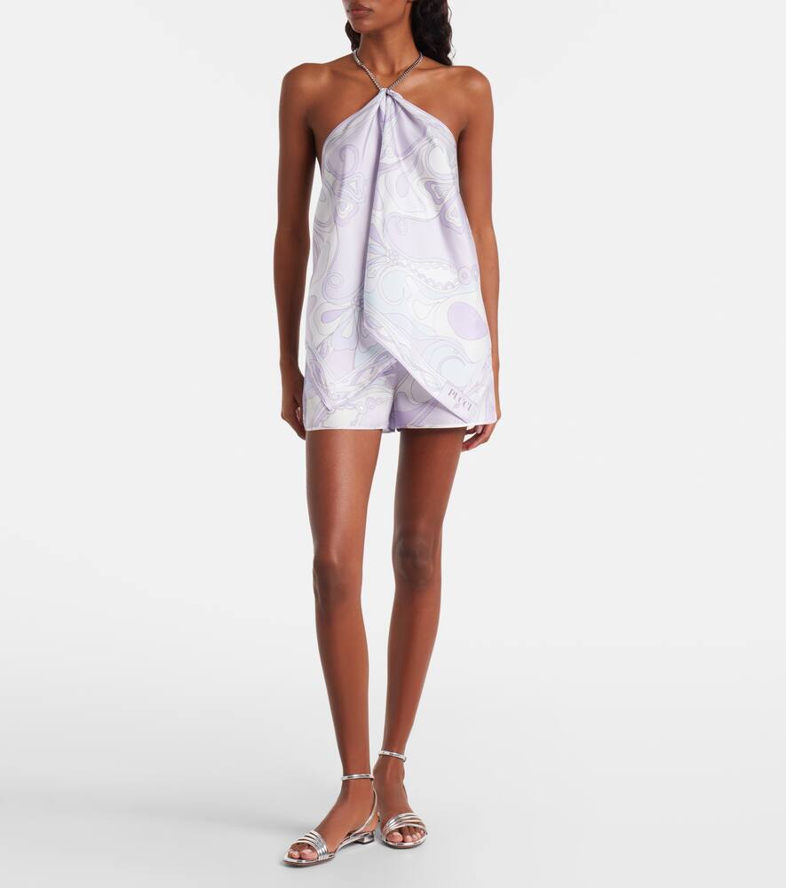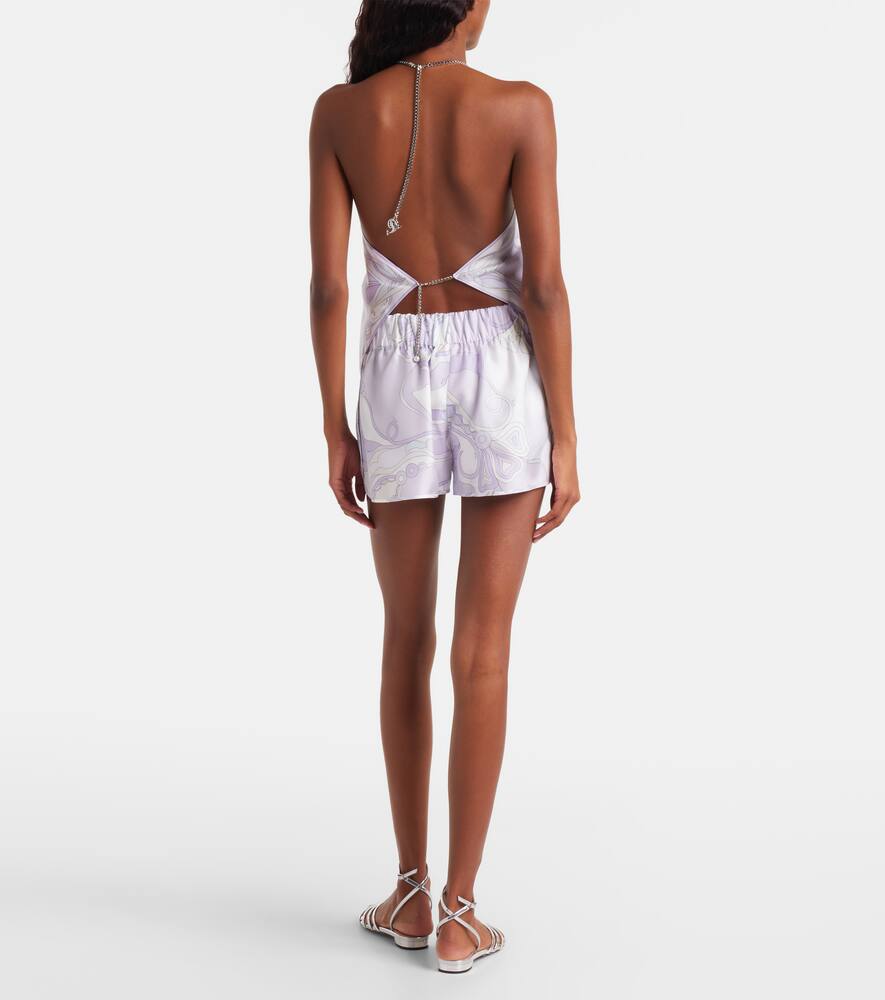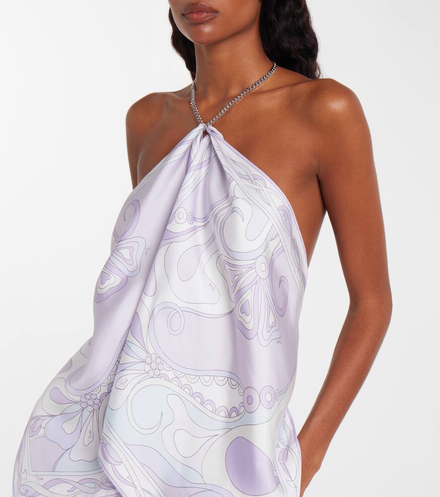 Культовый психоделический узор в виде завитков — фирменный знак бренда, благодаря которому Pucci получил титул Принца принтов. Этот топ без рукавов из шелкового твила украшен принтом Орхидея и дополнен декорированной цепочкой-халтер.