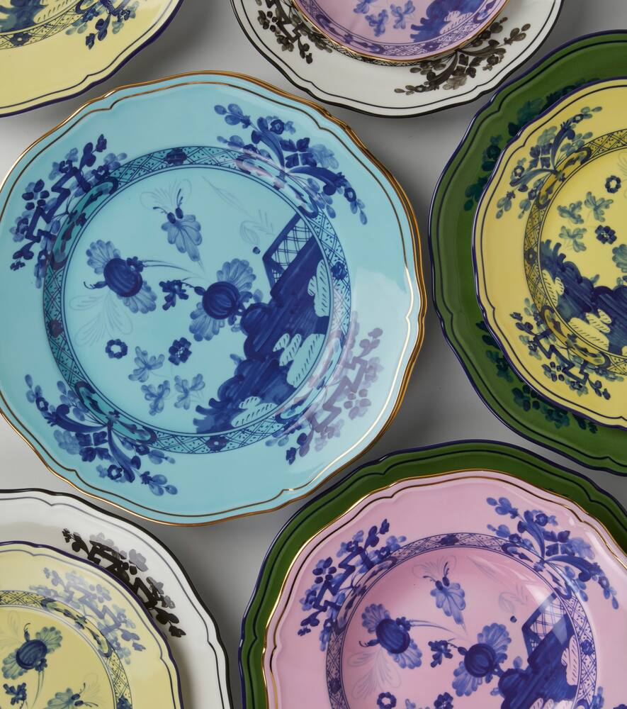 Коллекция Oriente Italiano от Ginori 1735, представляющая собой переосмысление Ясухиро Кикуоки гарофано – стилизованной гвоздики, прикреплённой в стиле шинуазри к флорентийской керамике, – возвращает нас в давно минувшие времена. Серия, отличающаяся нежными оттенками, создаваемыми с помощью техники аэрографа на знаменитом стиле Antico Doccia этого фарфорового гиганта, отличается богатой и экзотической эстетикой. Эта плоская обеденная тарелка сочетает в себе высококачественный итальянский фарфор и оттенки зелёного, создавая яркий контраст, который оживит любой стол.