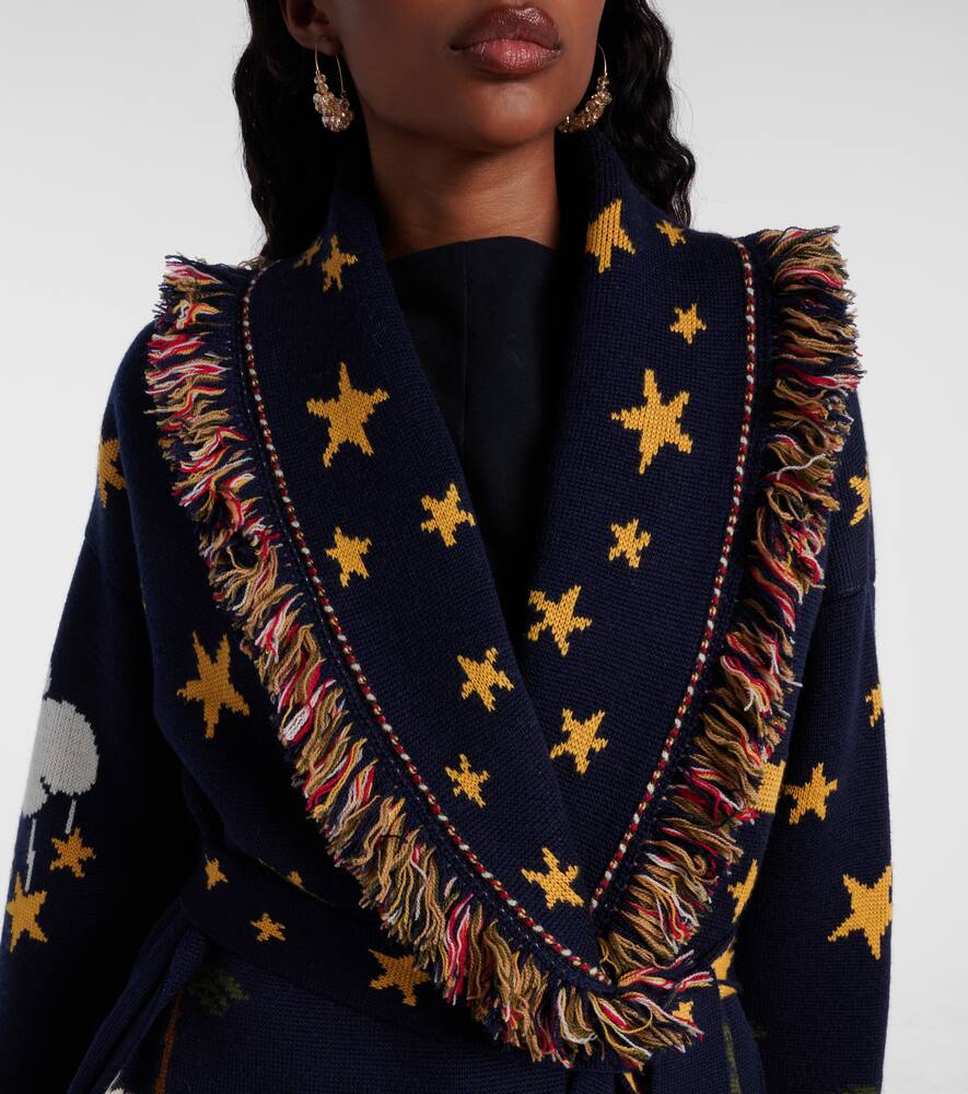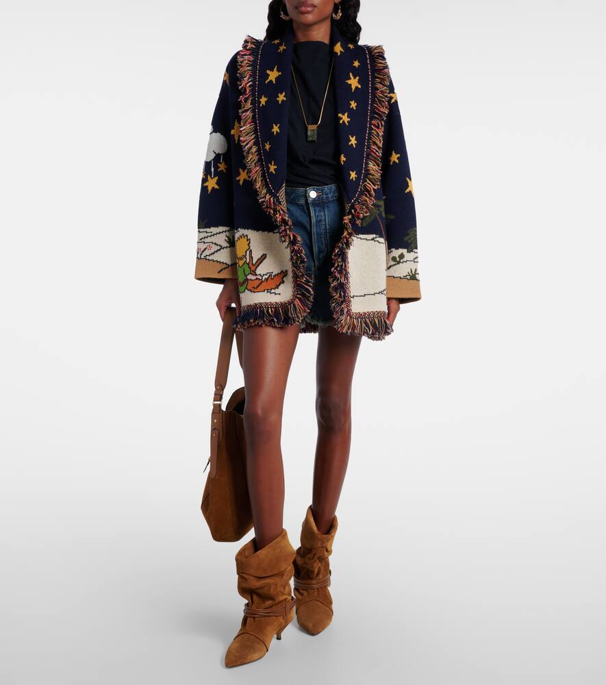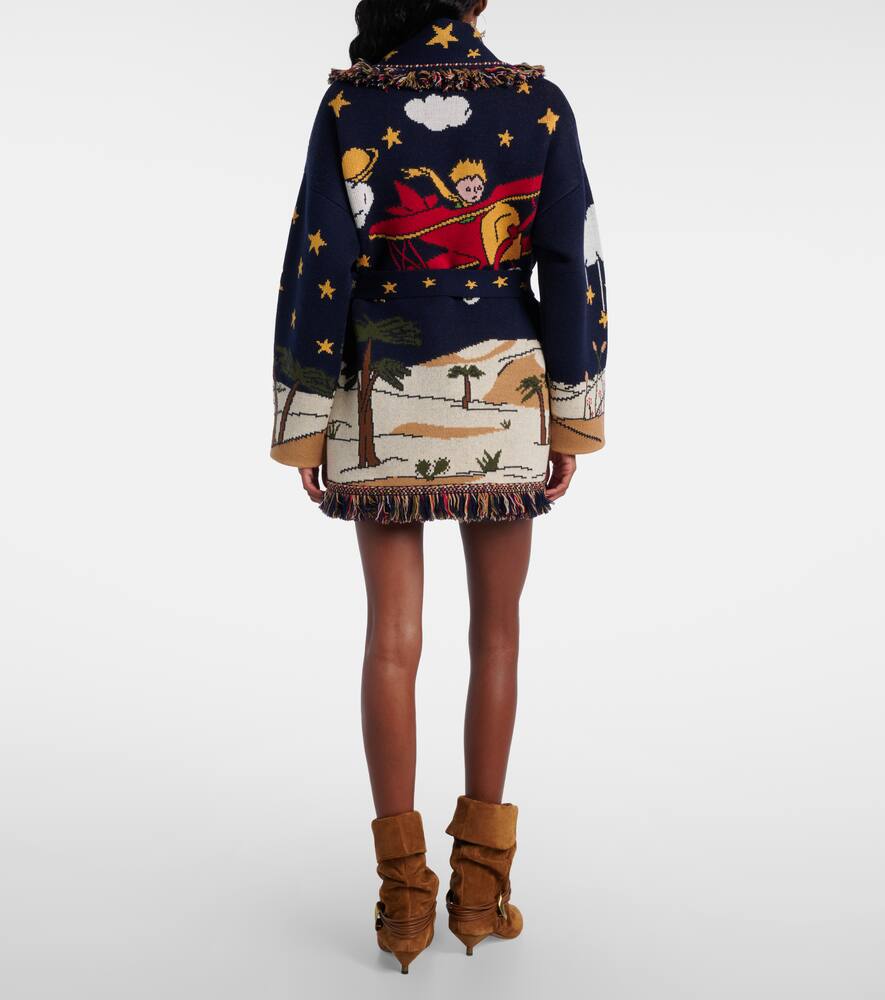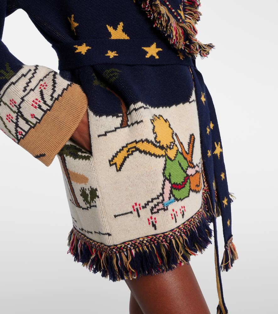 Кардиган Маленький принц от Alanui связан из мягкой натуральной шерсти двойной жаккардовой вязки. Этот стильный кардиган с иллюстрациями к классической сказке Антуана де Сент-Экзюпери дополнен бахромой по краям, прорезными карманами и съёмным поясом.