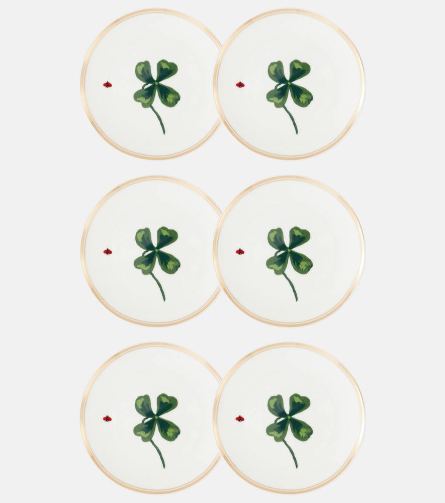 Этот набор из шести фарфоровых тарелок из коллекции Funky Table итальянского бренда Bitossi — лёгкий способ украсить стол. Благодаря элегантному золотому краю и украшению в виде клеверного листа в центре каждой тарелки можно мыть в посудомоечной машине. Они подойдут для неформальной сервировки стола и могут комбинироваться с другими предметами из той же коллекции.