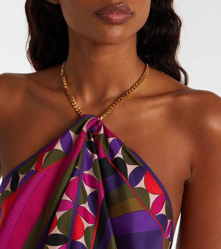 Культовый психоделический узор в виде завитков — фирменный знак бренда, благодаря которому Pucci получил титул Принца принтов. Этот топ без рукавов из шелкового твила украшен принтом Iride и дополнен золотистой цепочкой-халтер.