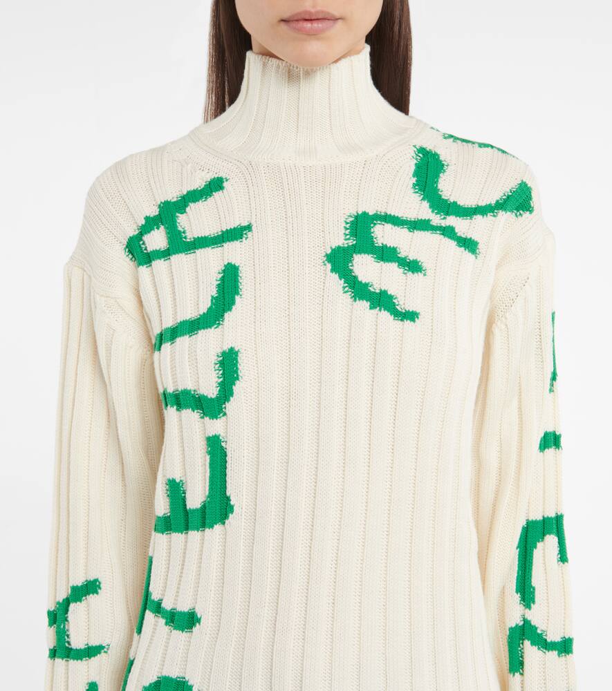 Этот унисекс-свитер из капсульной коллекции Shared 3 Стеллы Маккартни расписан вручную зелёными буквами логотипа, вдохновлёнными граффити, которые разработал художник Эд Кёртис. Ребристая вязка из белой шерстяной пряжи, утеплённый высокий воротник и свободный крой.