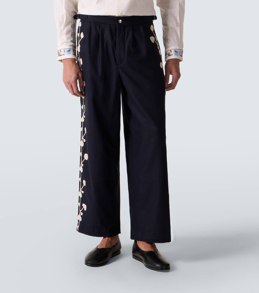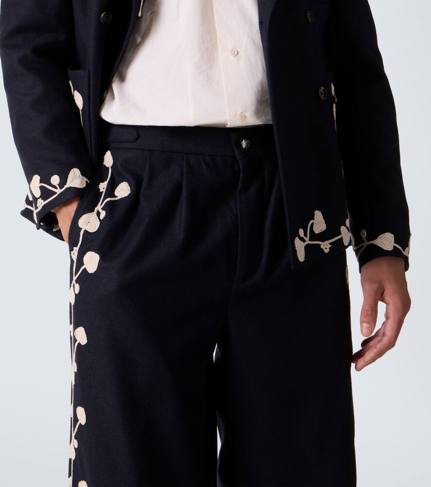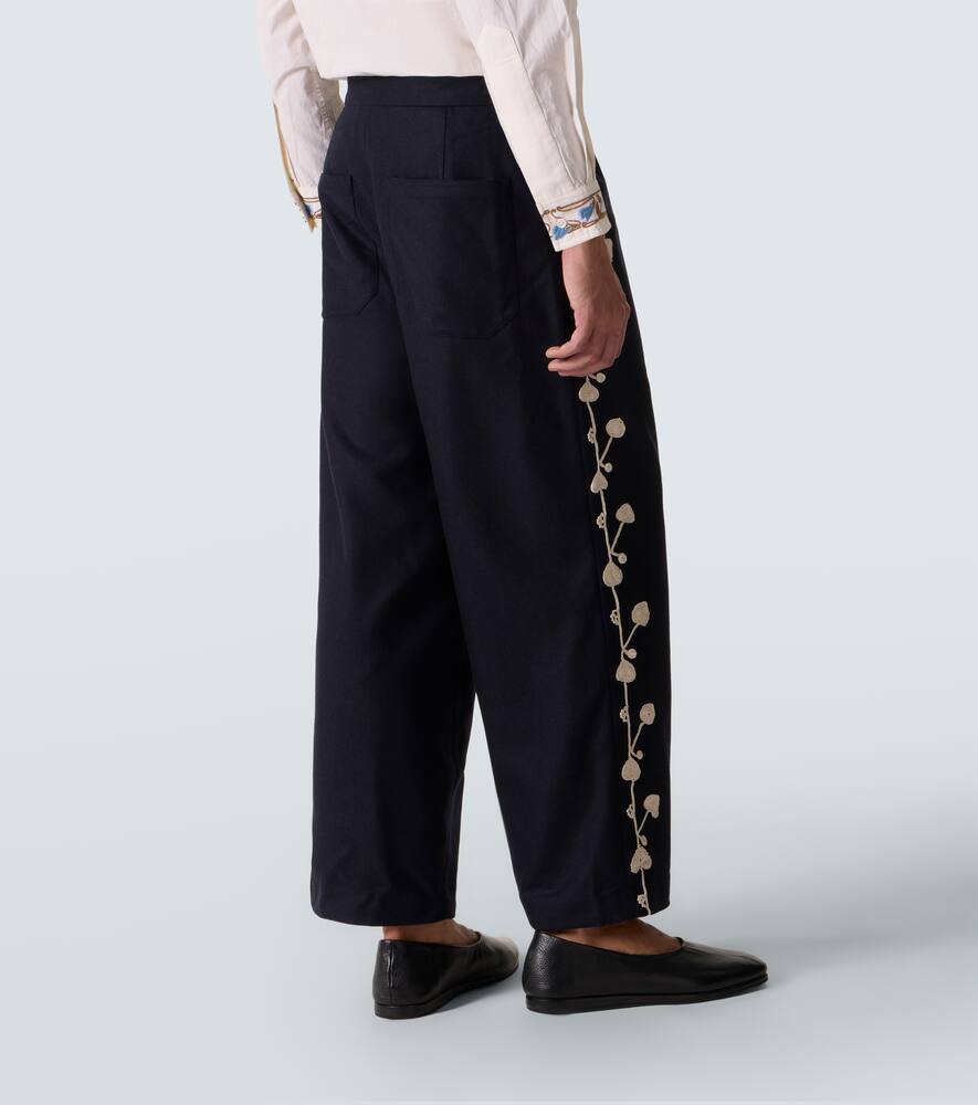 Имея единственную миссию — рассказывать истории через моду, Bode создаёт ностальгические модели, используя исторические техники и винтажные узоры. Широкие брюки Snowdrop из шерстяной смеси украшены изысканными аппликациями по всей длине штанины.
