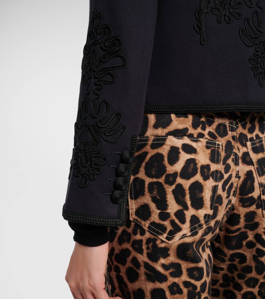 Темно-синяя куртка Latrell от Veronica Beard отличается укороченным силуэтом без воротника и структурированным кроем. Украшенная изысканной вышивкой, плетеной отделкой и обтянутыми пуговицами, эта модель легко перейдет из дневного образа в вечерний.