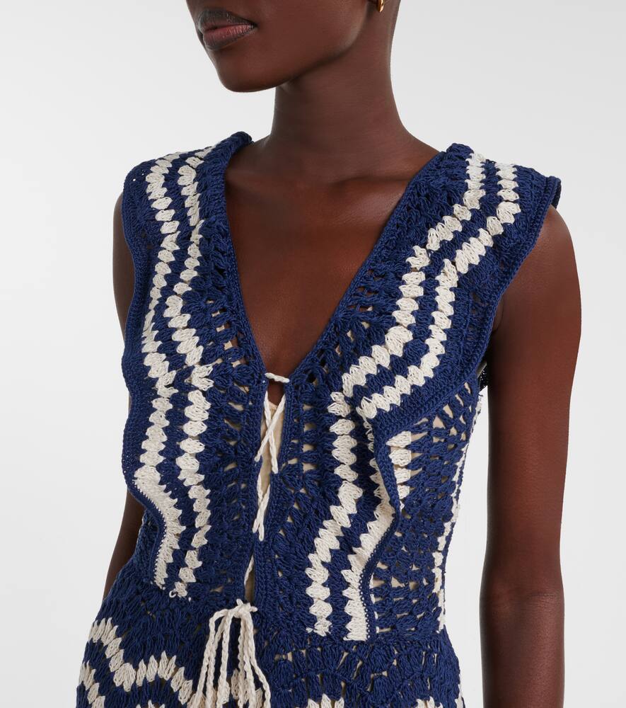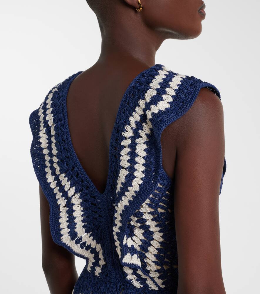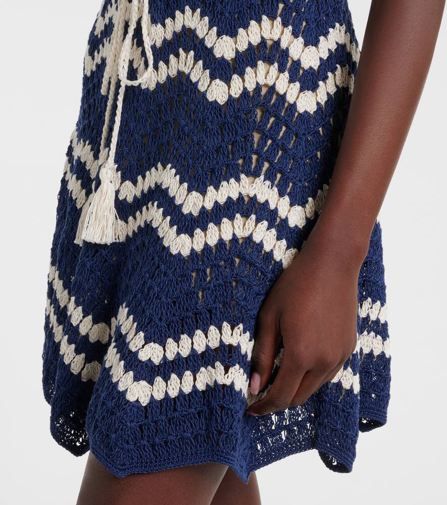 Изделия Анны Костуровой изготавливаются вручную мастерицами, занимающимися вязанием крючком и тай-дай, чьи семьи занимаются этим ремеслом уже много поколений. Мини-платье Мелисса связано крючком из хлопка с оборкой на лифе и расклешенным подолом.
