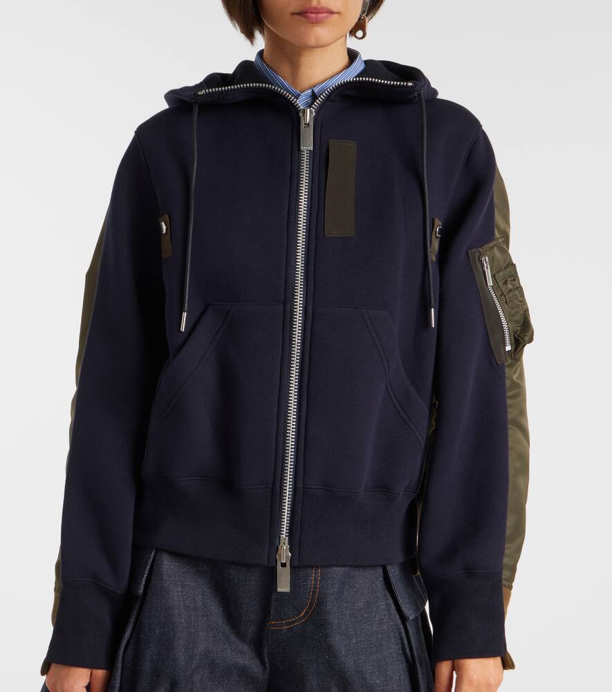 Склонность Sacai к гибридным дизайнам позволяет сочетать контрастные текстуры, ткани и техники, создавая совершенно уникальные и инновационные образы. Эта толстовка с капюшоном из хлопковой смеси дополнена вставками из нейлонового твила и дополнена двусторонней молнией спереди.