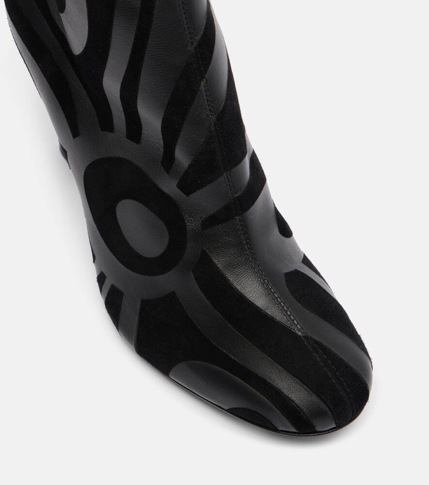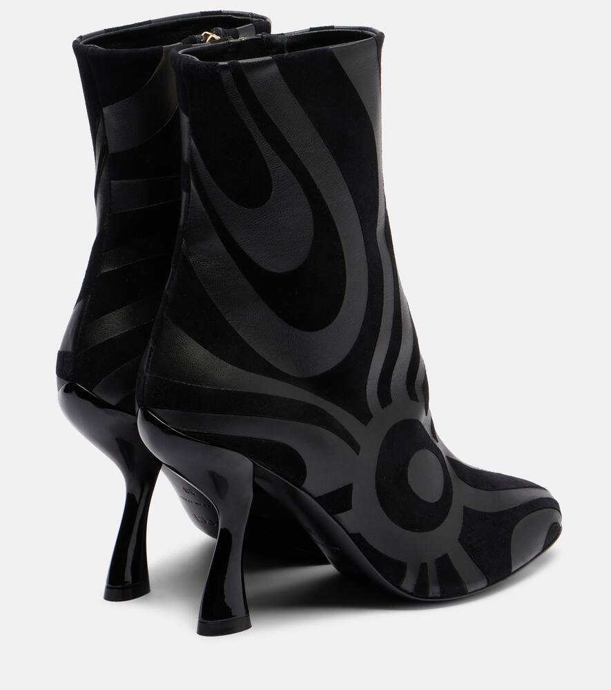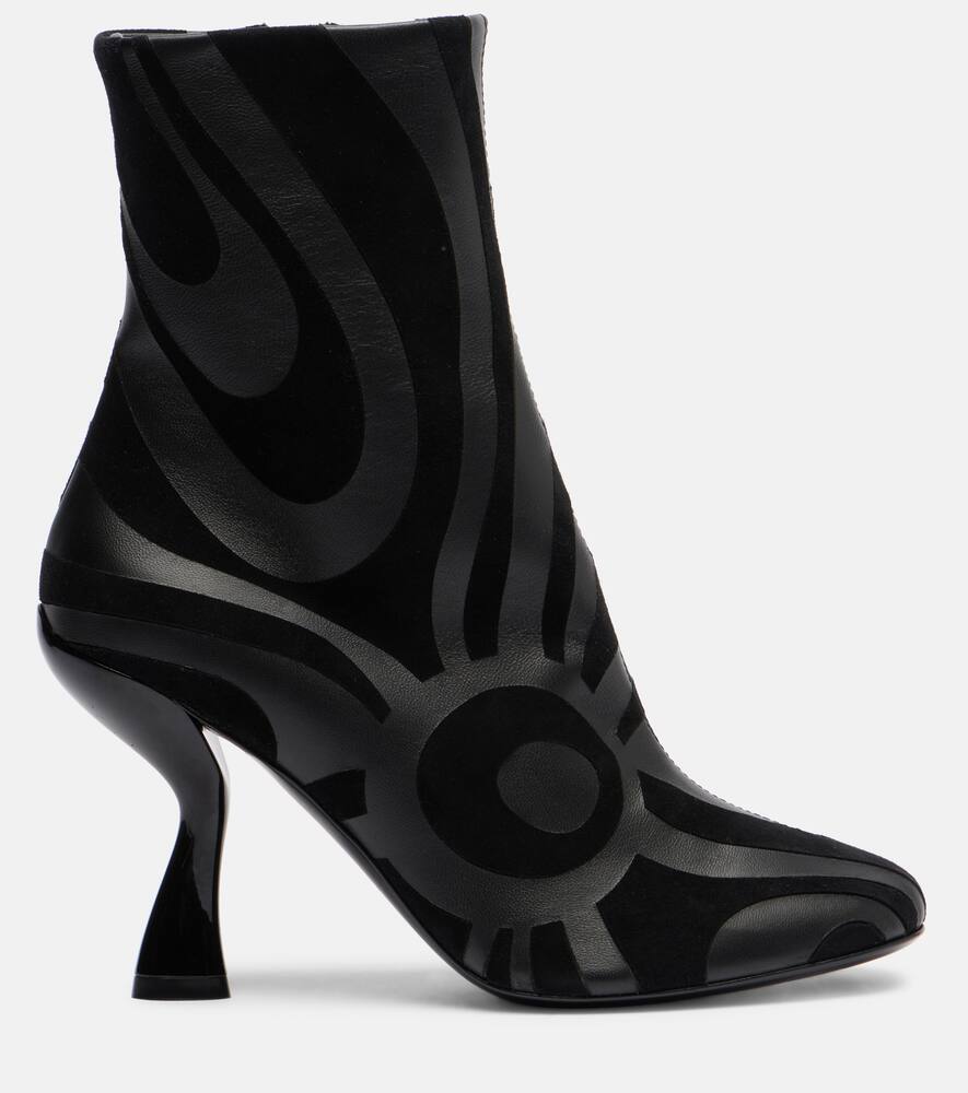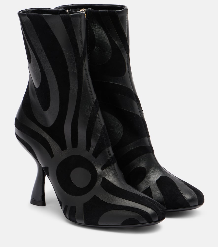 Культовый психоделический узор в виде завитков — фирменный знак бренда, благодаря которому Pucci получил титул Принца принтов. Эти ботильоны, изготовленные в Италии из замши и кожи в тон, украшены фирменным узором Marmo.